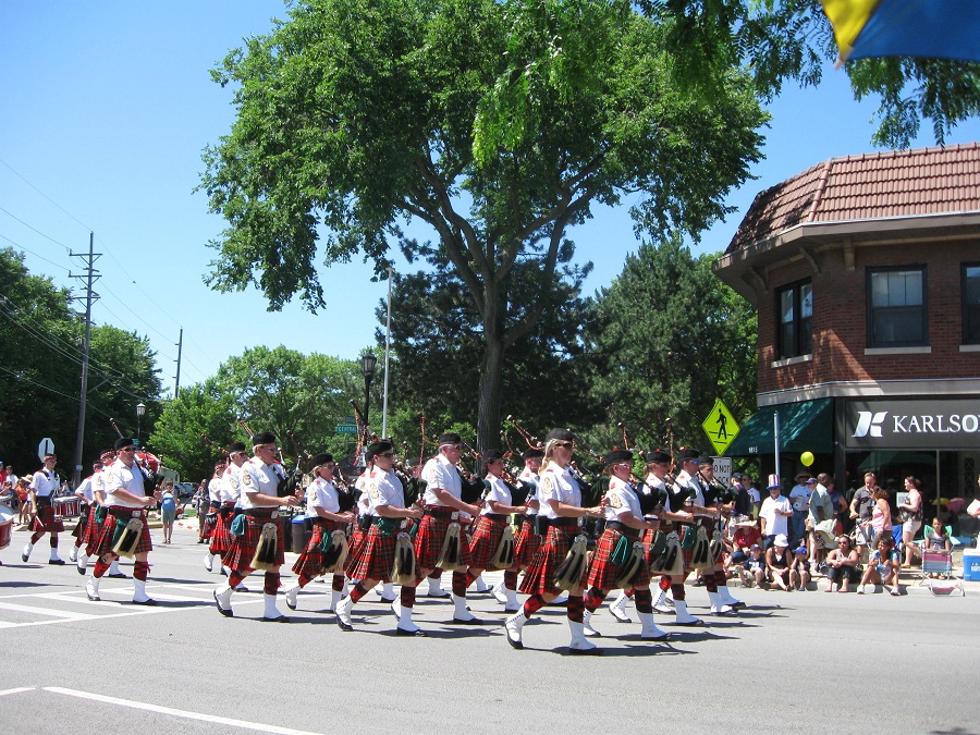 Kilted men all playing bagpipes
