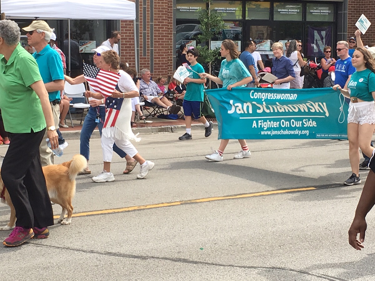 Jan Schakowsky -- Jan is holding the US flag at left and is wearing a verticle US flag