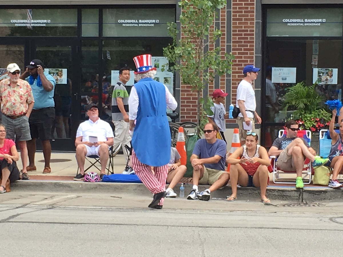 A small boy in a patriotic chair on Central Street