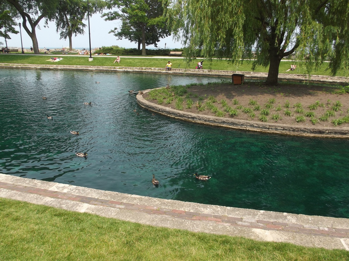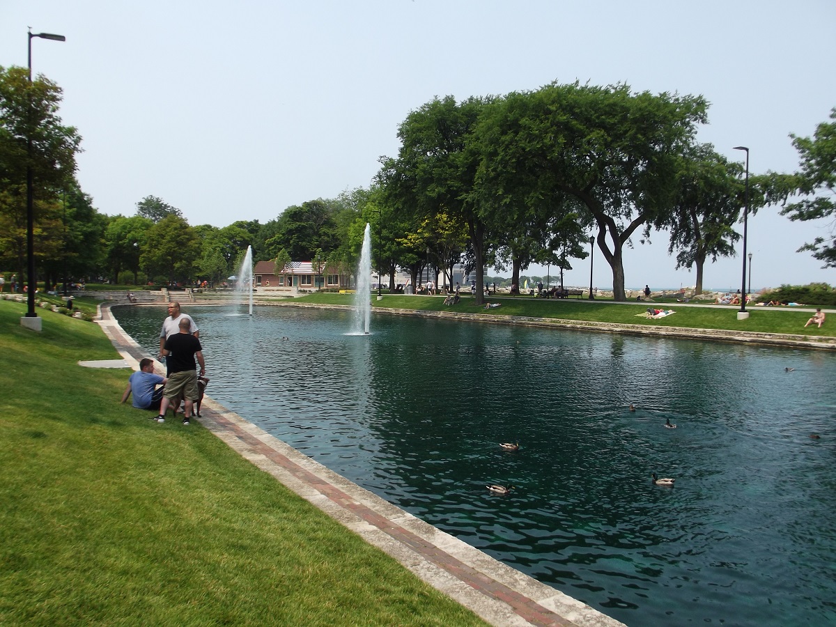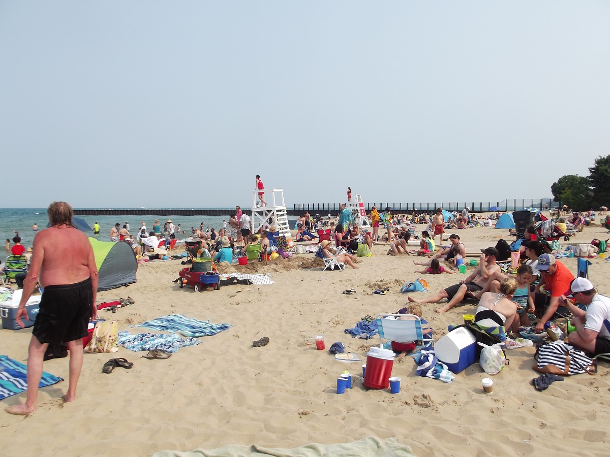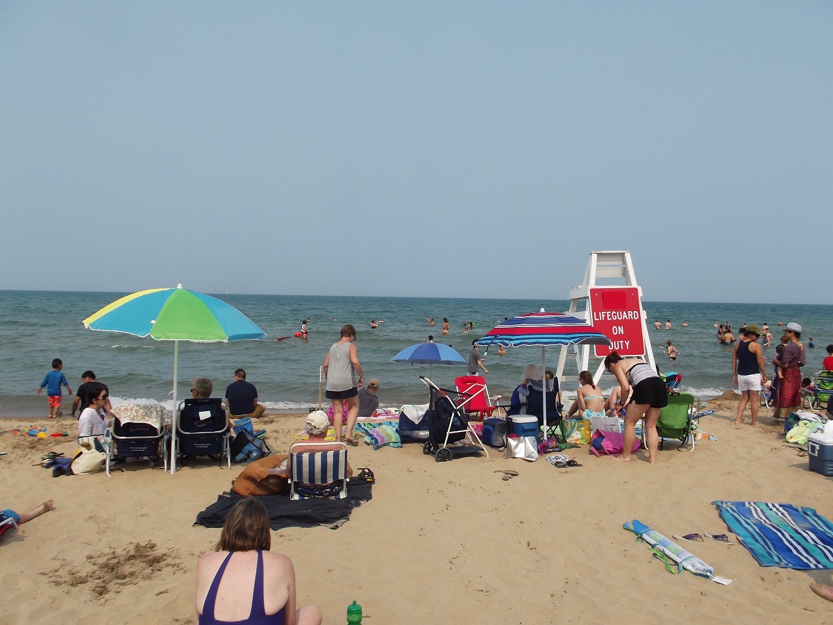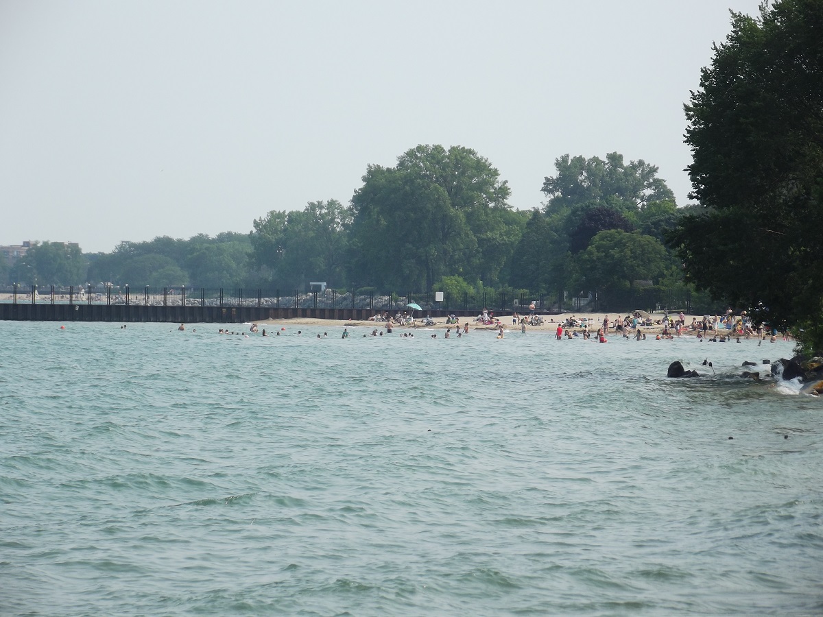 Looking southwest at swimmers off Lee Street Beach