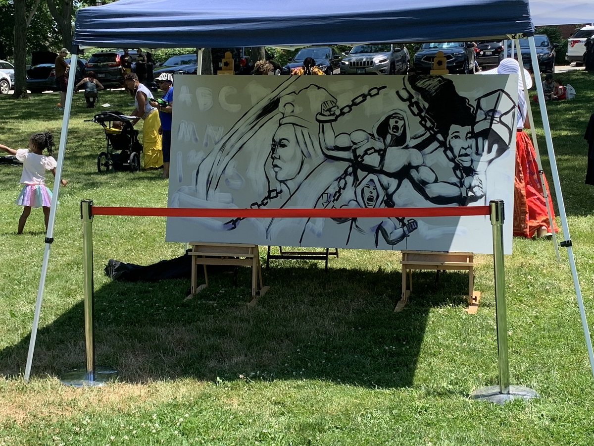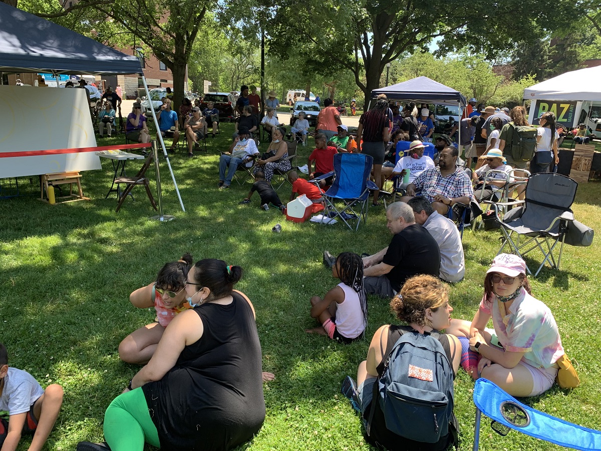 Many people in shade under two huge cottonwood trees in middle where I sat