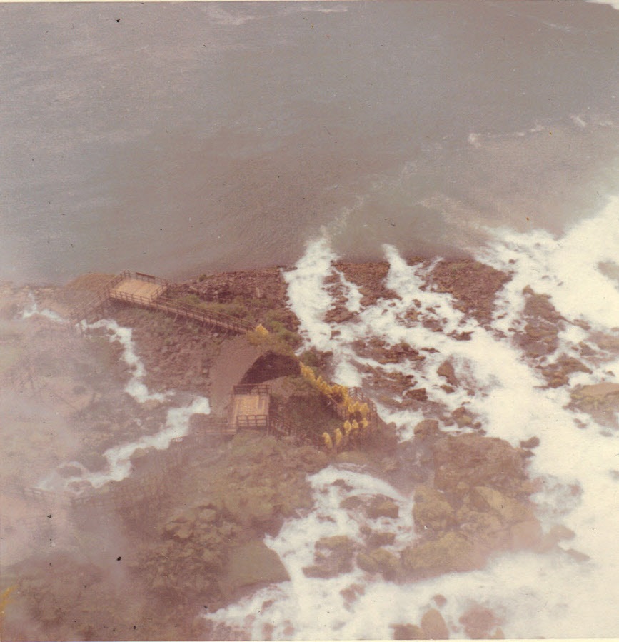 Andy, Jim & Dad all got into yellow raincoats to walk on wooden decks below Niagra Falls, NY-- summer, 1959