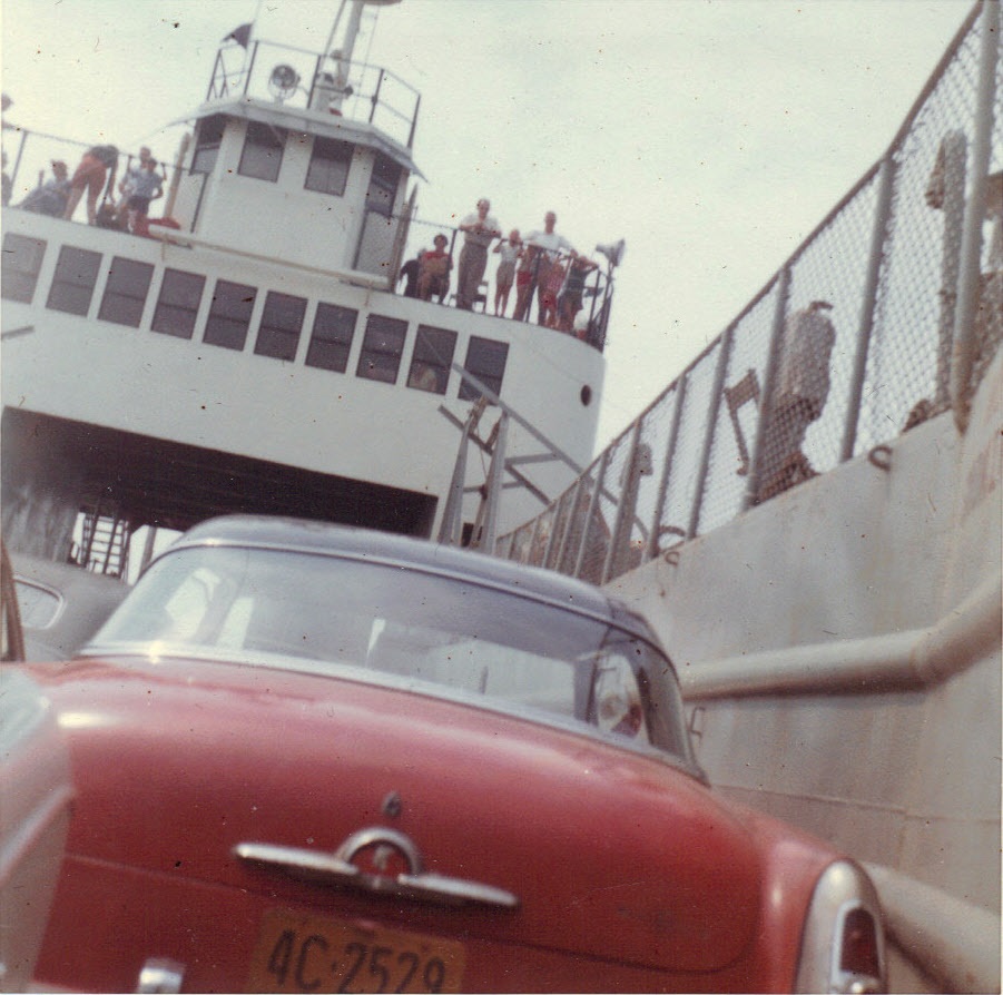 Andy, Carol, Dad, Dorothy, Jim (right-most on upper deck rail) ferry from Montauc Point, L.I. to New London, Conn. -- summer, 1959