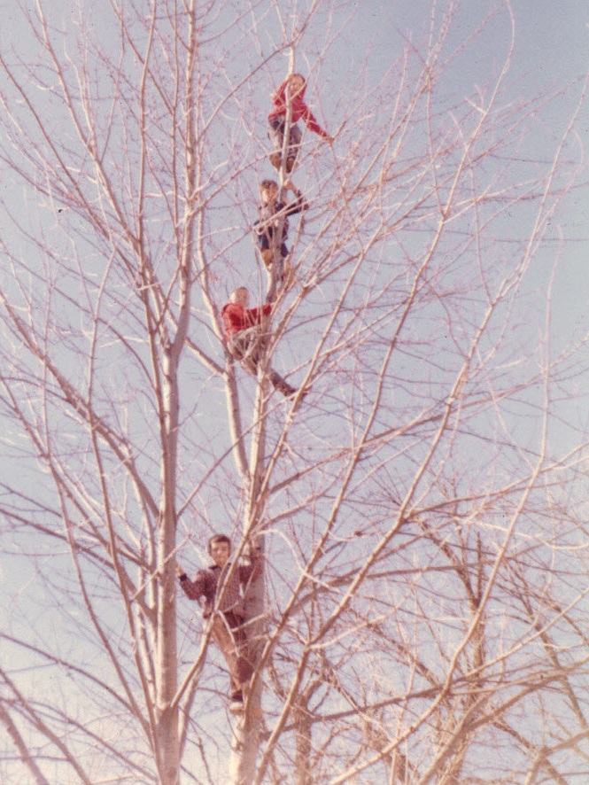 Andy (at top), John Searles, David Searles, Wally Bowels up maple tree -- winter, 1959