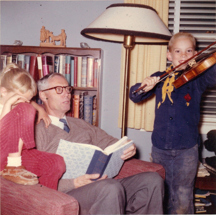 Carol, Grandfather, Andy playing violin in cub scout uniform -- late spring, 1959