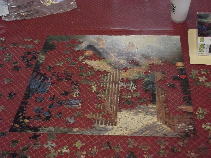 Partially (just under 50%) completed second much more difficult 500 piece puzzle just before Margaret and I tore it apart and put it away 11:30AM on Sunday