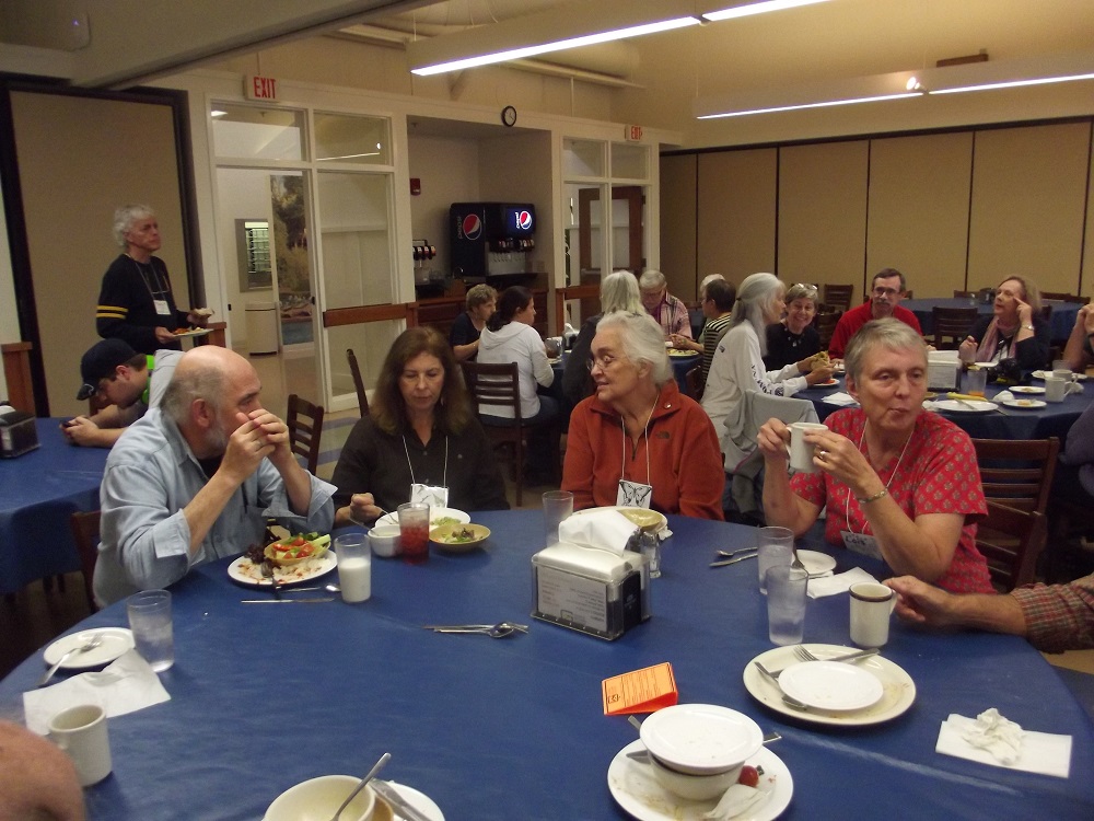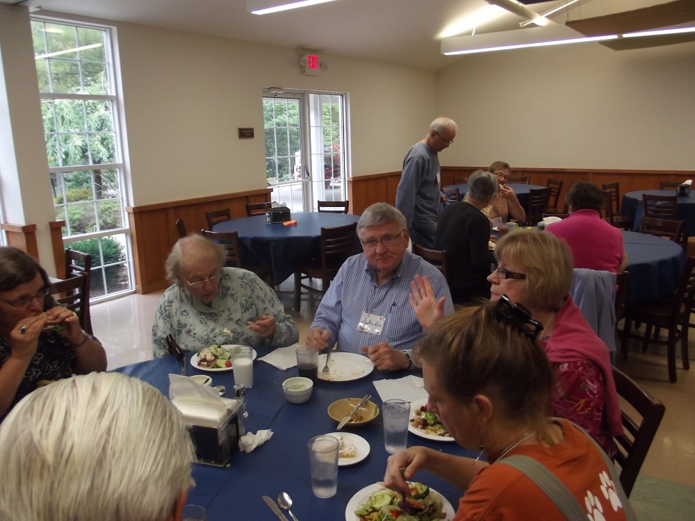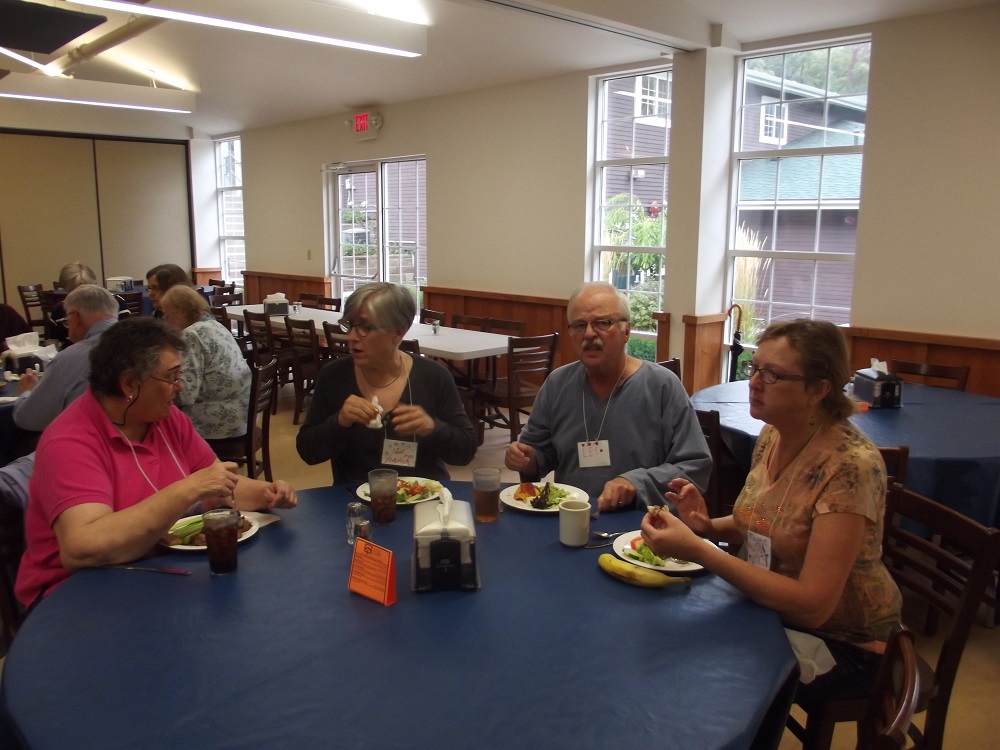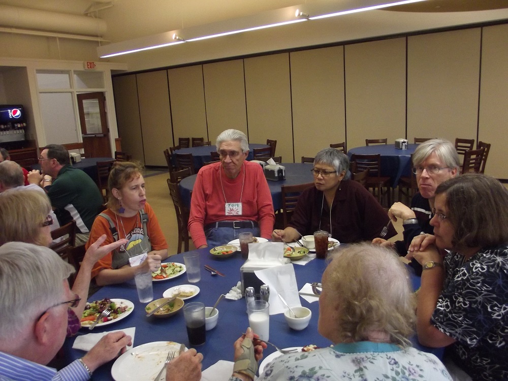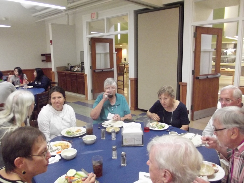Rebecca, Tom, Alicia, and others eating with Dave and Alma