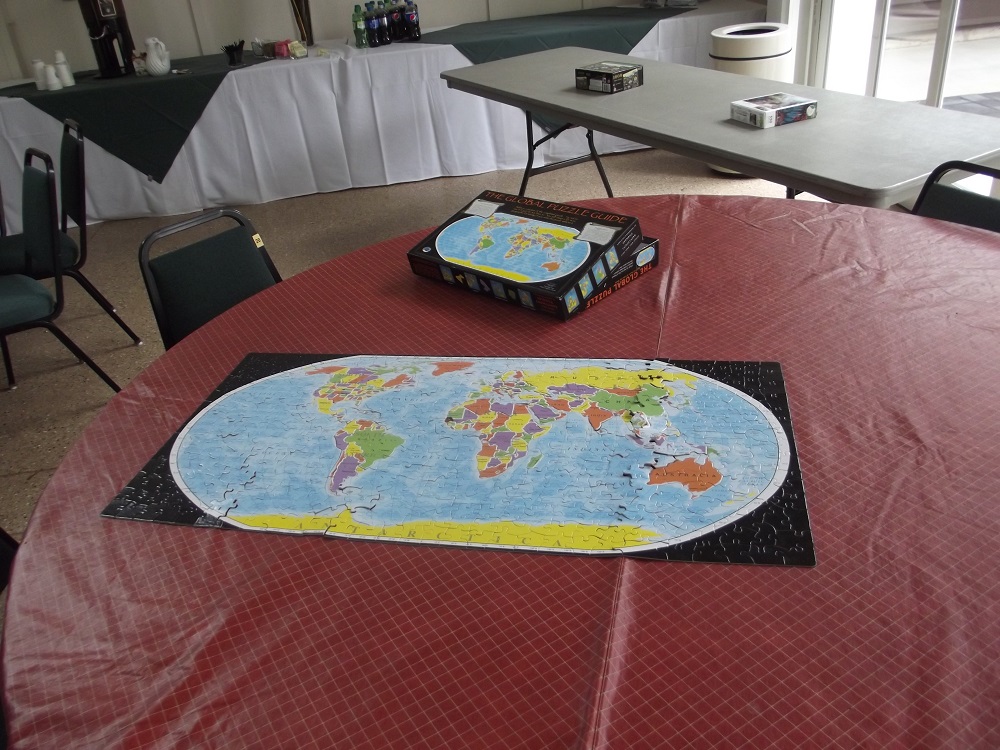 Completed 500 piece world puzzle, but with a major rupture through Asia and the Indian Ocean due to crease in table cover