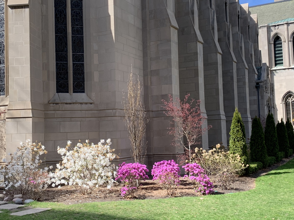 White and purple bushes by First United Methodist Church on Hinman Avenue