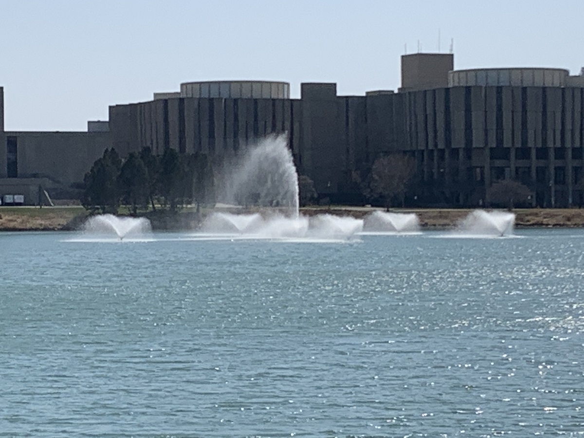 Lagoon with NU fountains blowing and modern library