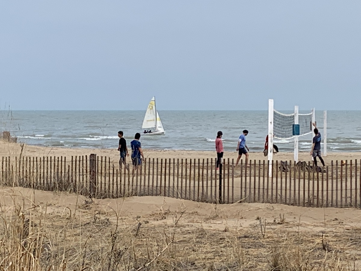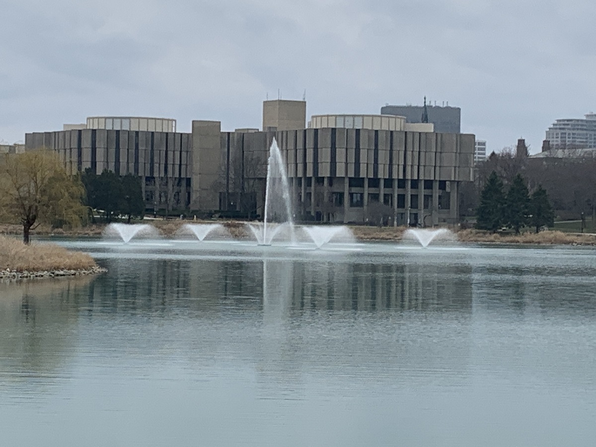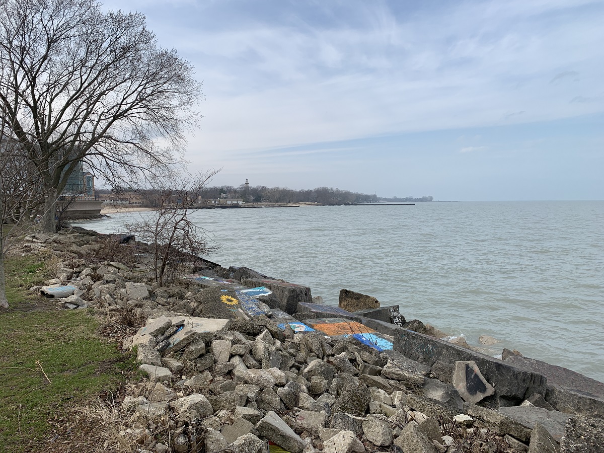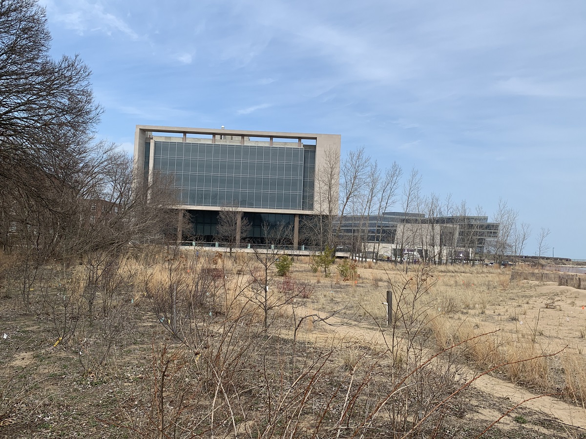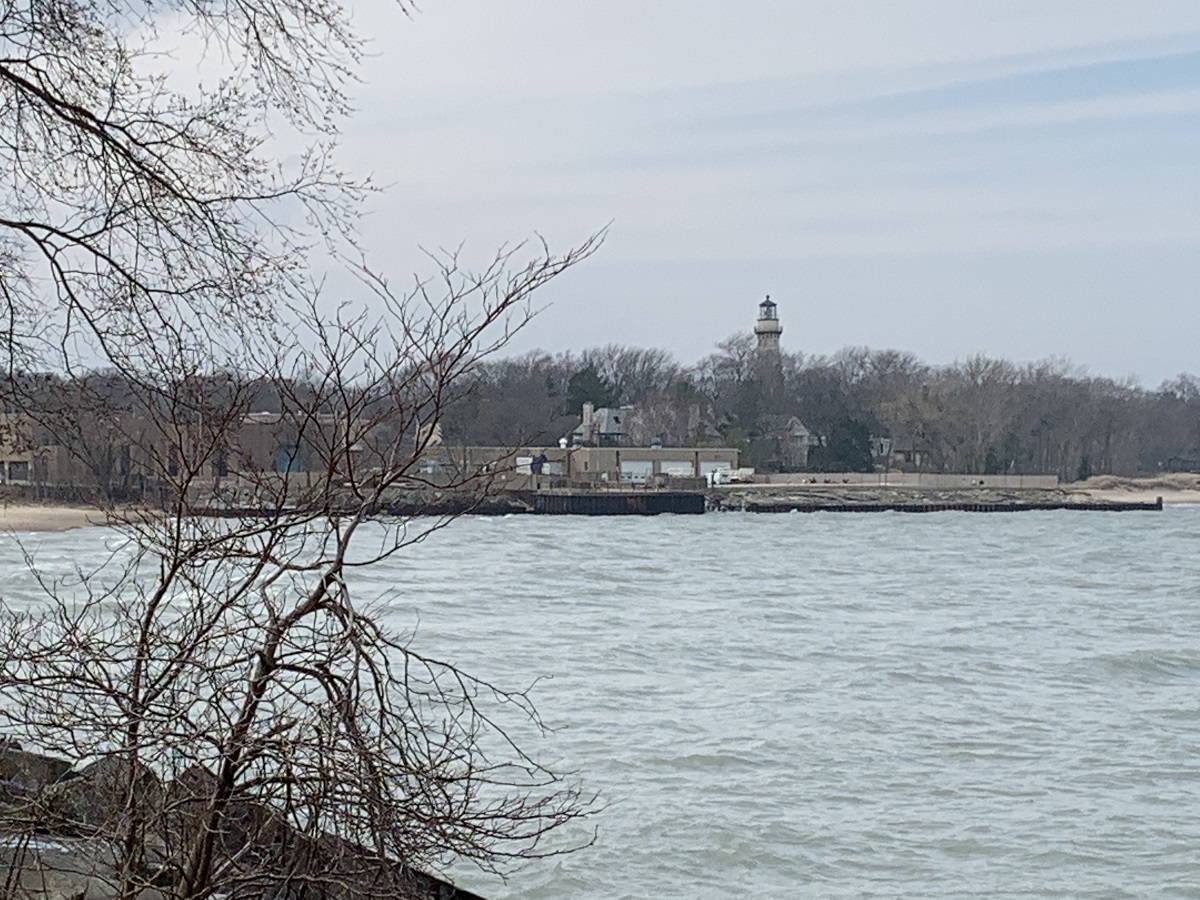 View to the NW from the NE corner of landfill showing Gross Point Lighthouse and top tip of Baha'i Temple