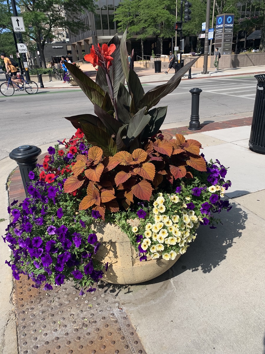 Beautiful bouquet in concrete pot at Downtown Evanston