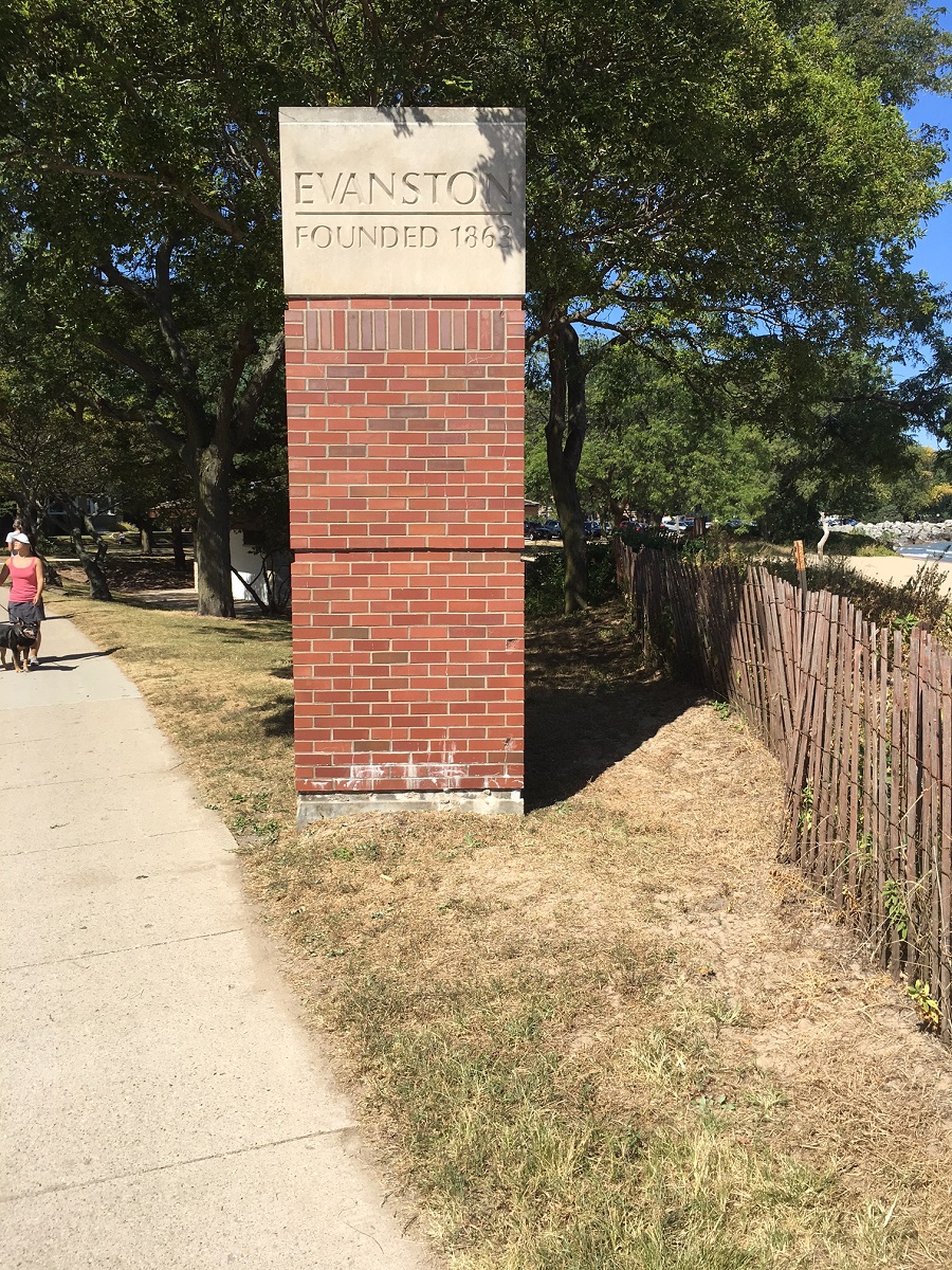 Brick pillar welcoming drivers on Sheridan Road to Evanston