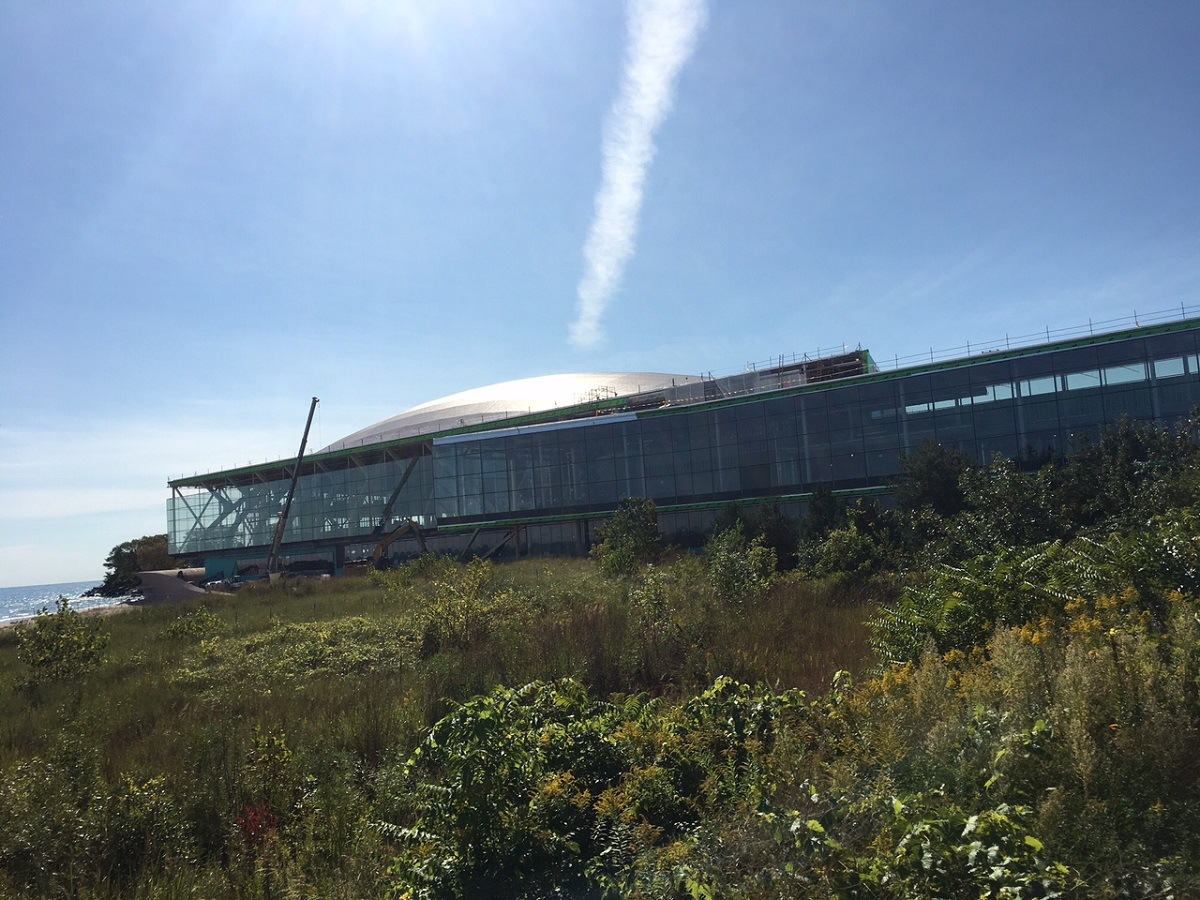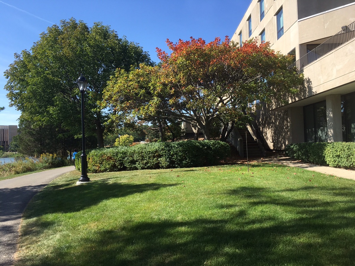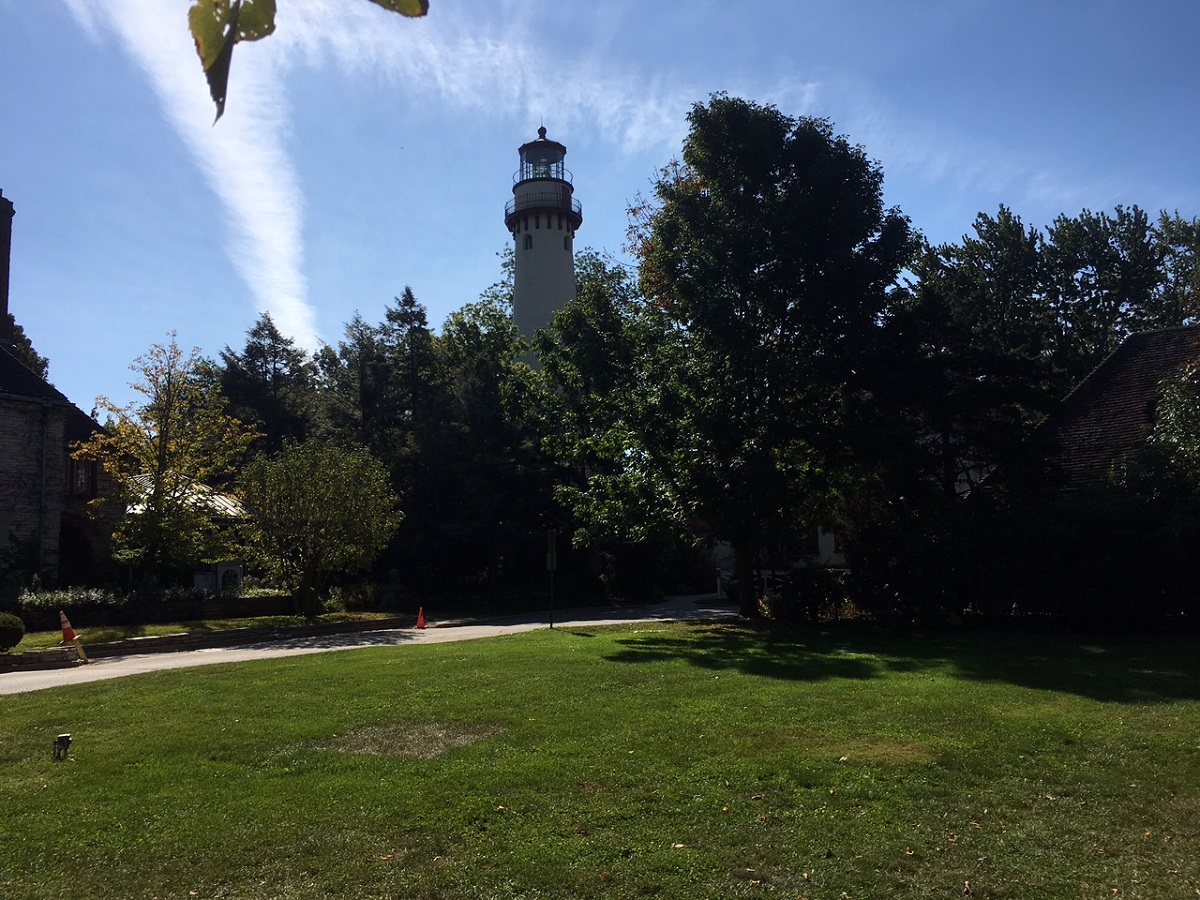 Arts Center, sign for lighthouse, and lighthouse through the tree