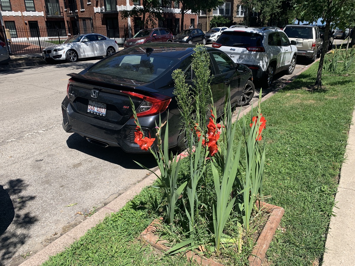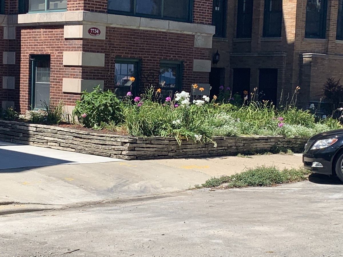 Red flowers on Rogers Ave. just east of Sheridan