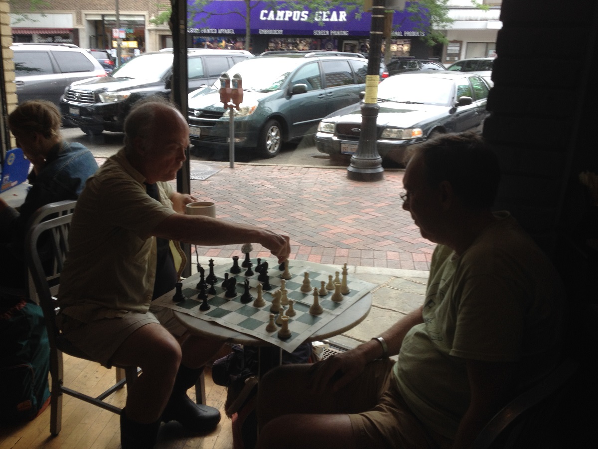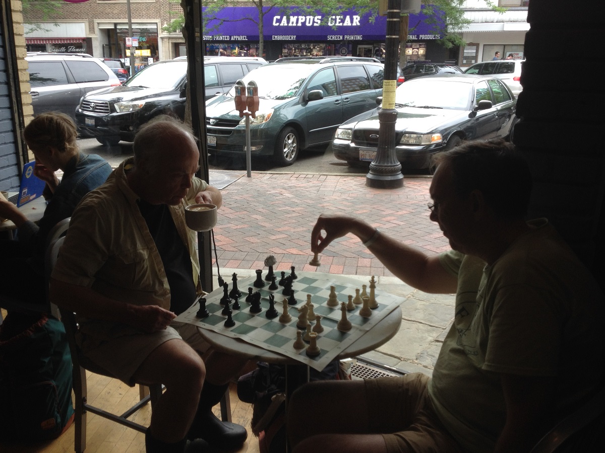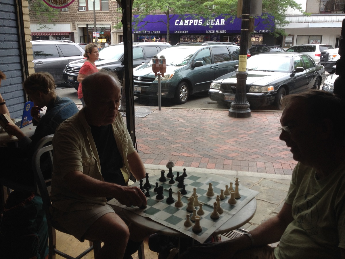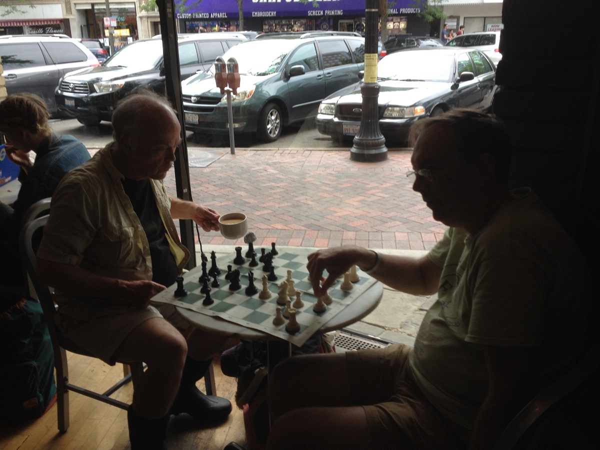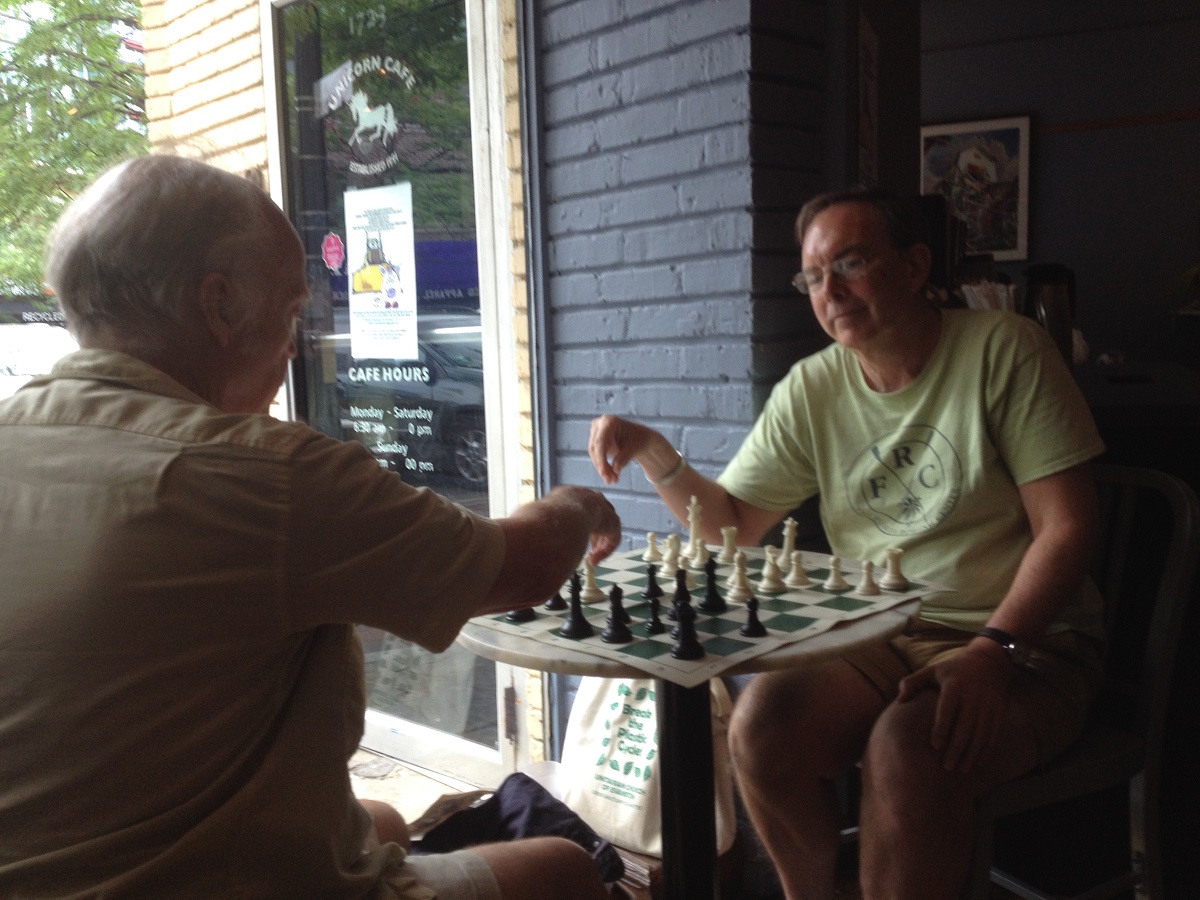 Larry and Andy playing chess at the Unicorn Cafe on Sherman Ave.