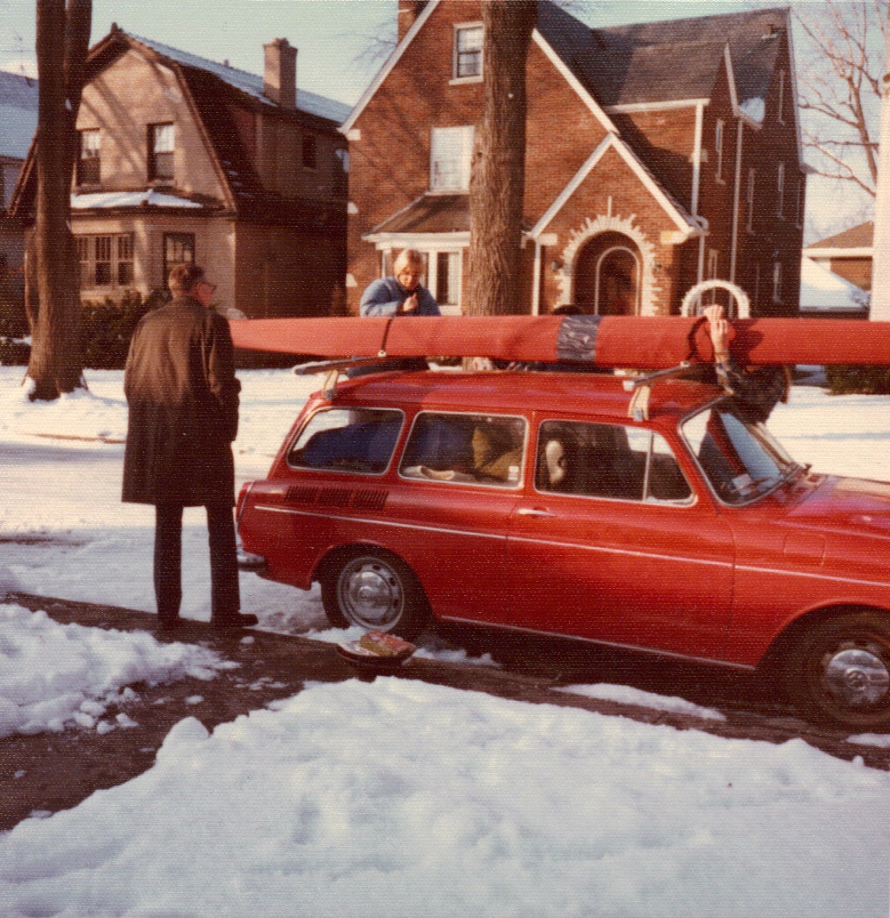 Dad, Carol attaching kayak to car