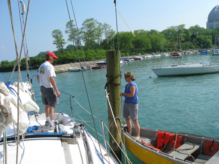 Wilmette harbor expert showing us proper way to moor Misty Winds between two large posts with her bow just off the concrete wall
