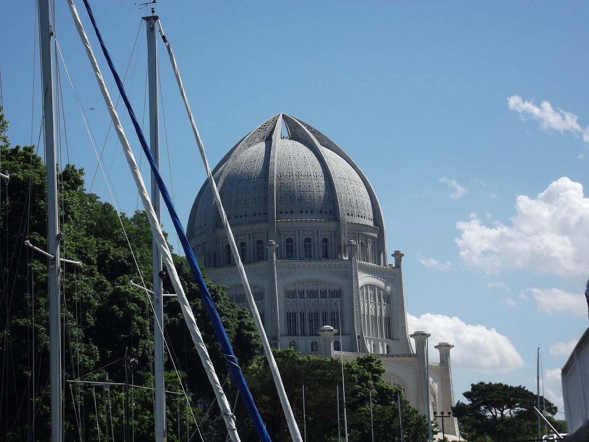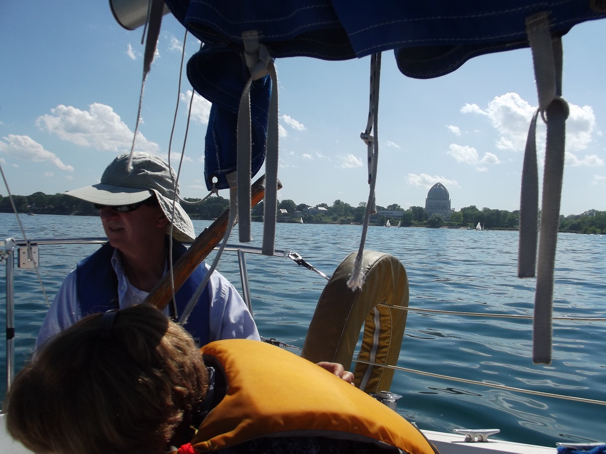 Bill and Dale on lake with Baha'i Temple and sailing class