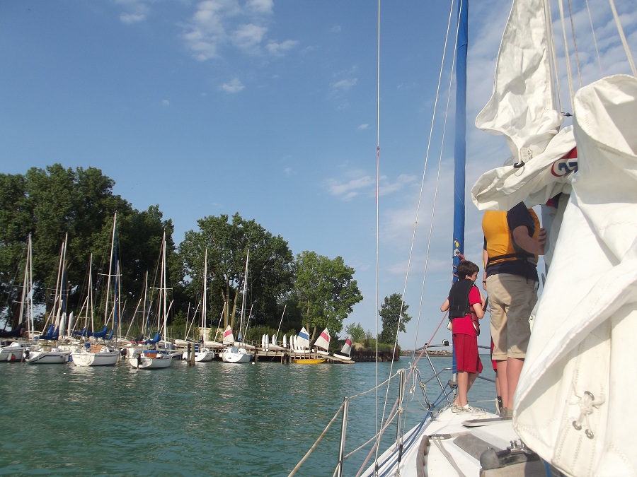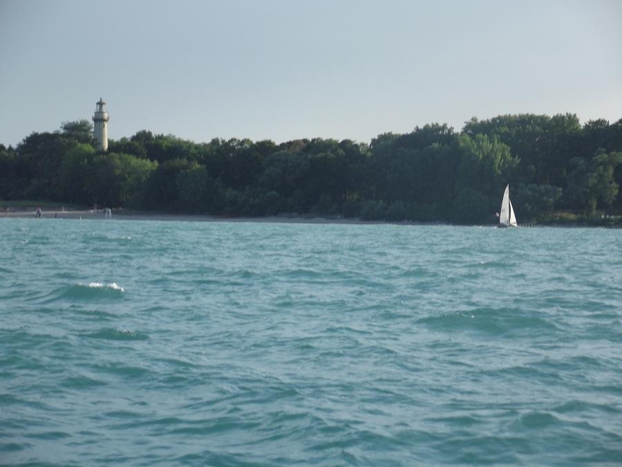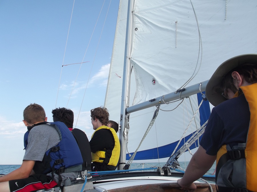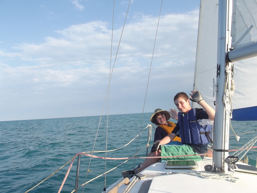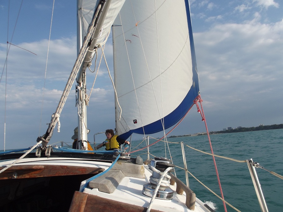 Two scouts on foredeck as we head south toward downtown Evanston and Chicago