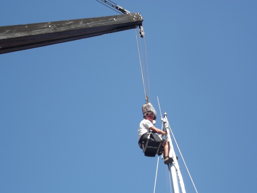 Man on chair from crane fixing haliard at top of mast in Wilmette Harbor