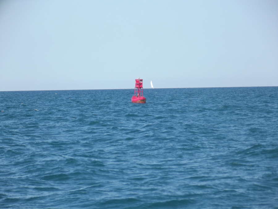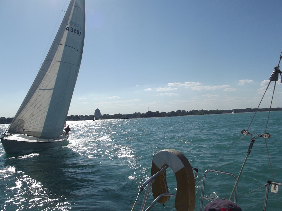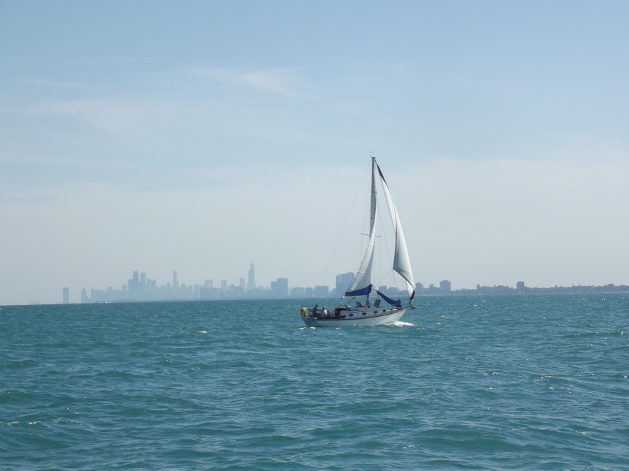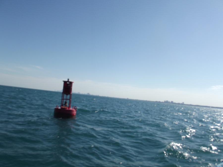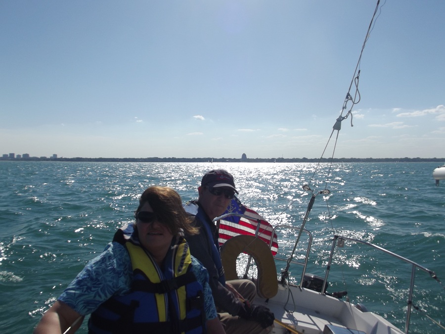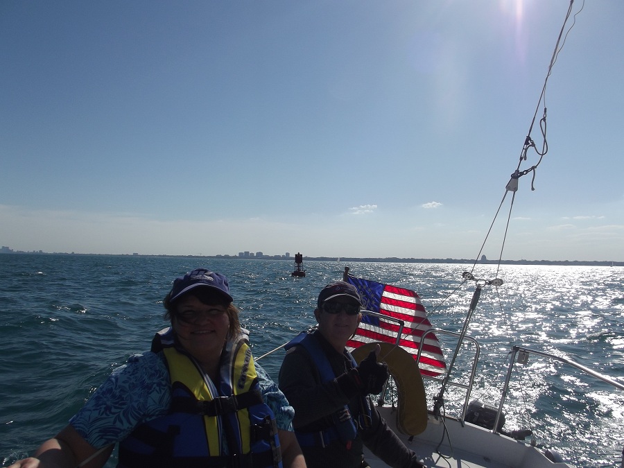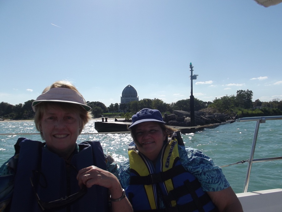 Dale and Bill with our flag, red bell buoy, a little of Chicago, Evanston, and Baha'i Temple