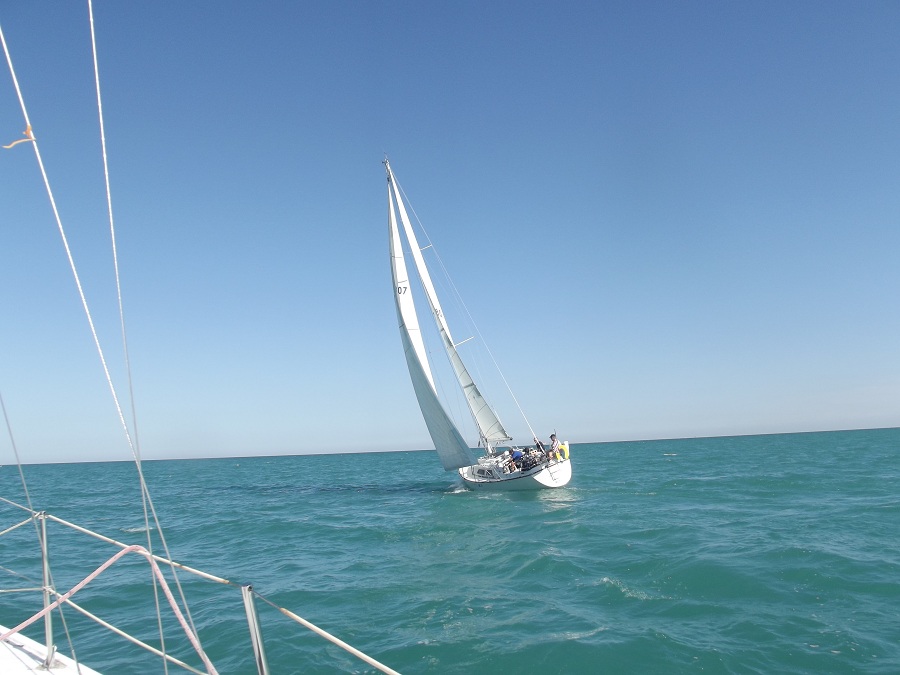 Larger boat we challanged in race still behind us with Baha'i Temple