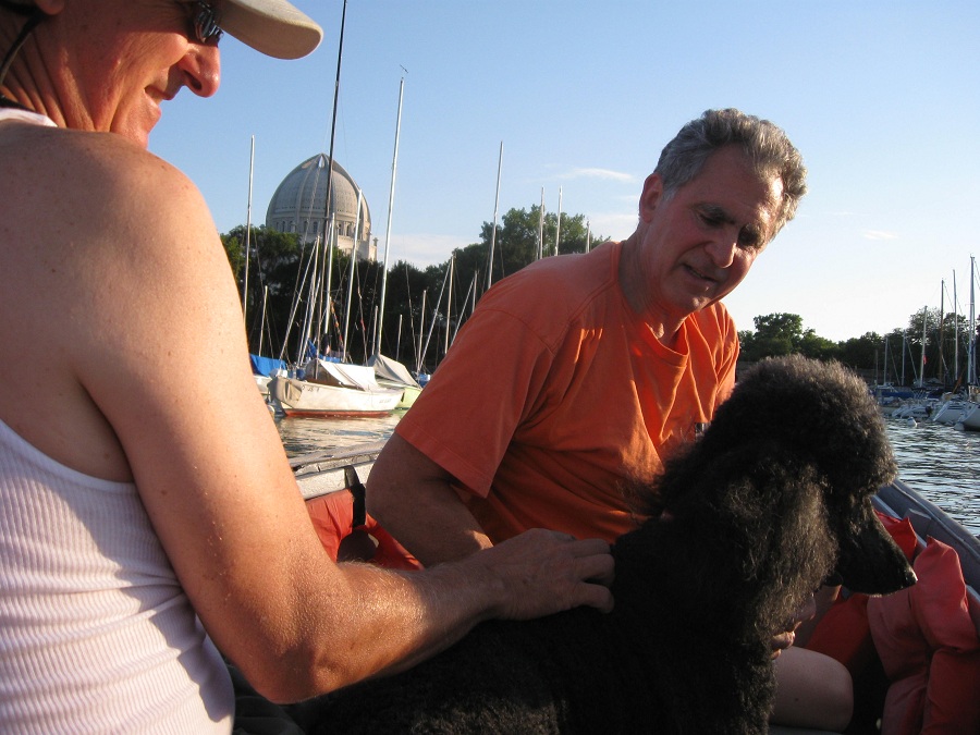 Taking dinghy back to dock with Bill, Baha'i Temple, owner, and poodle