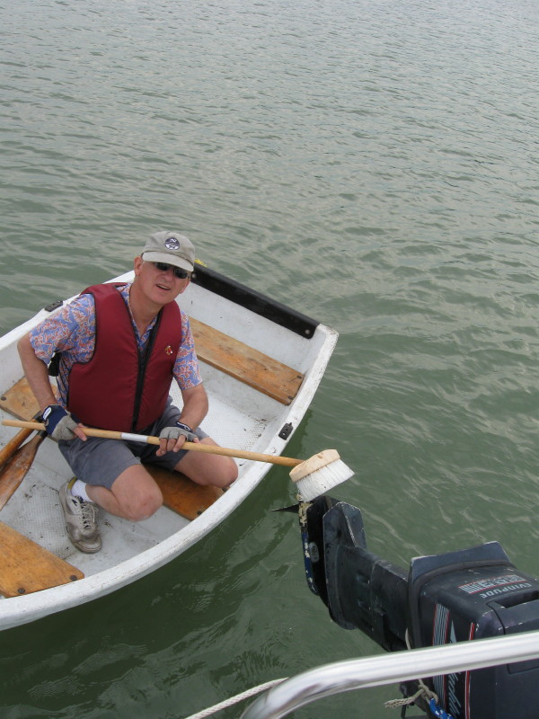 Bill cleaning green underwater growth off of motor