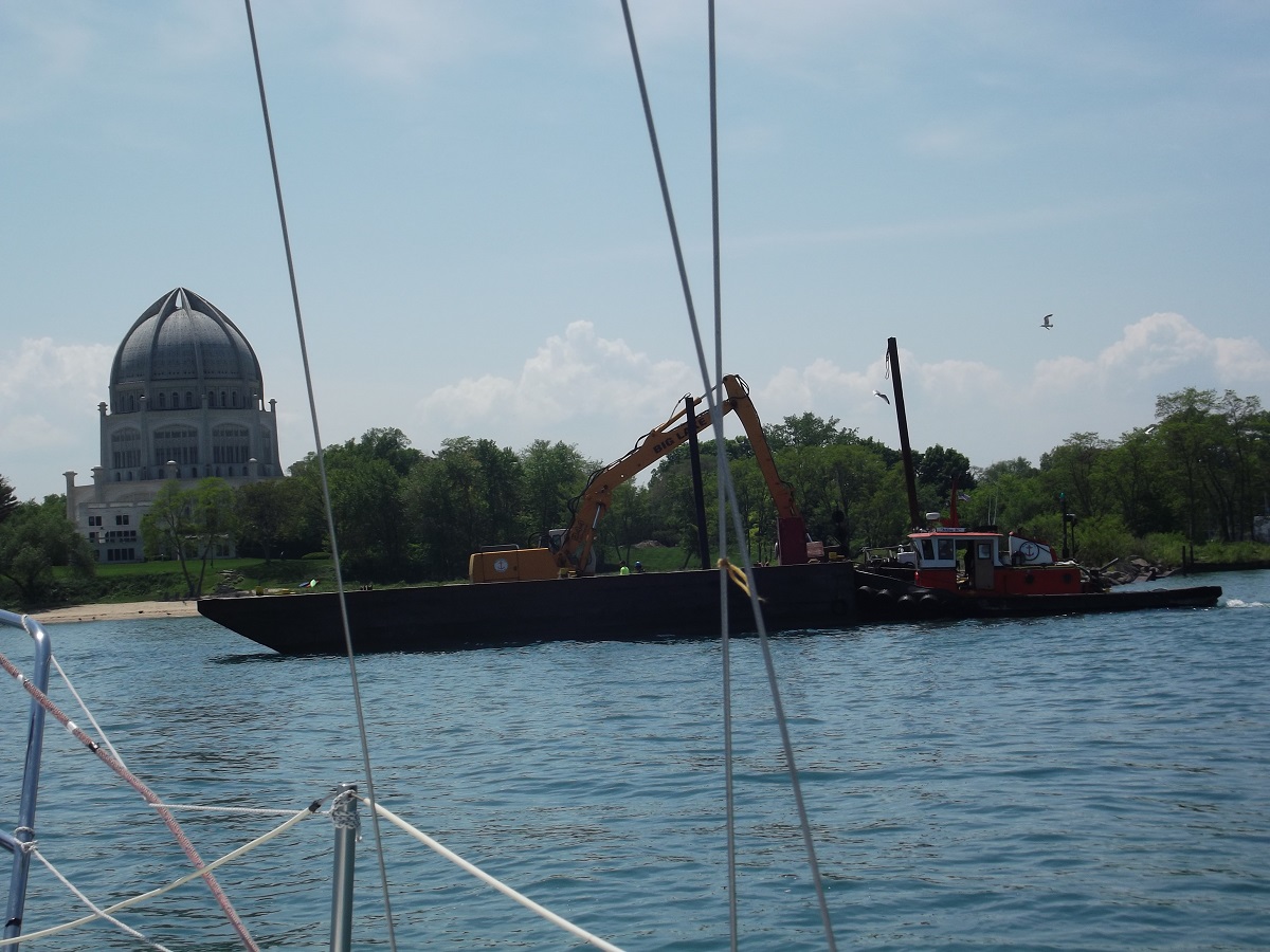 Baha'i Temple and dredging at entrance to Wilmette Harbor