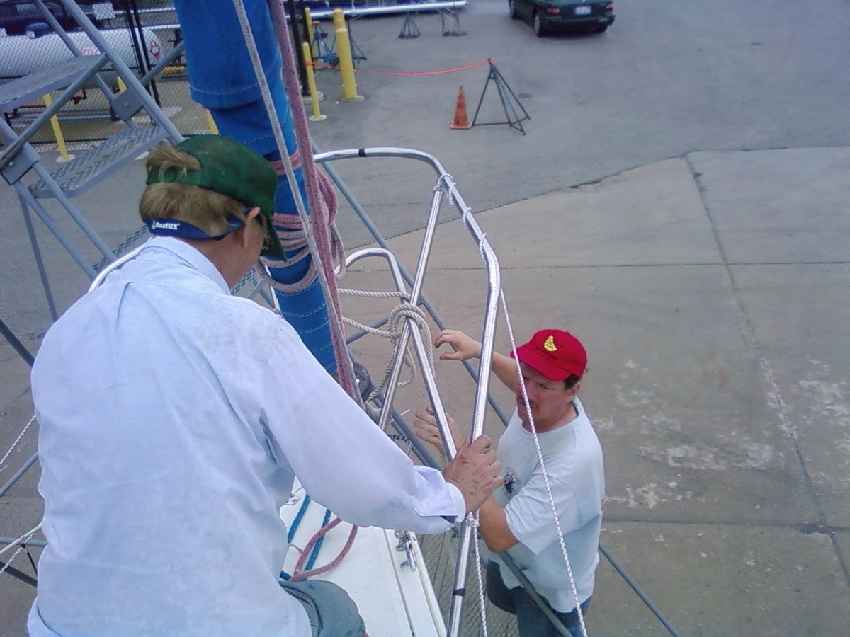Bill with another friend detatching the forestay so we could properly hook up the long blue loop line to opperate the jib roller/fuller