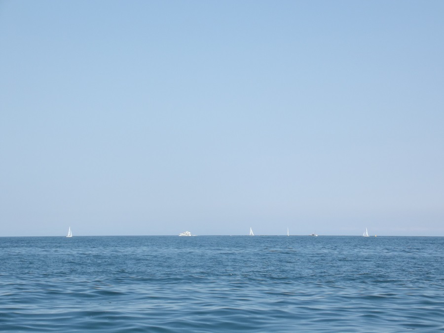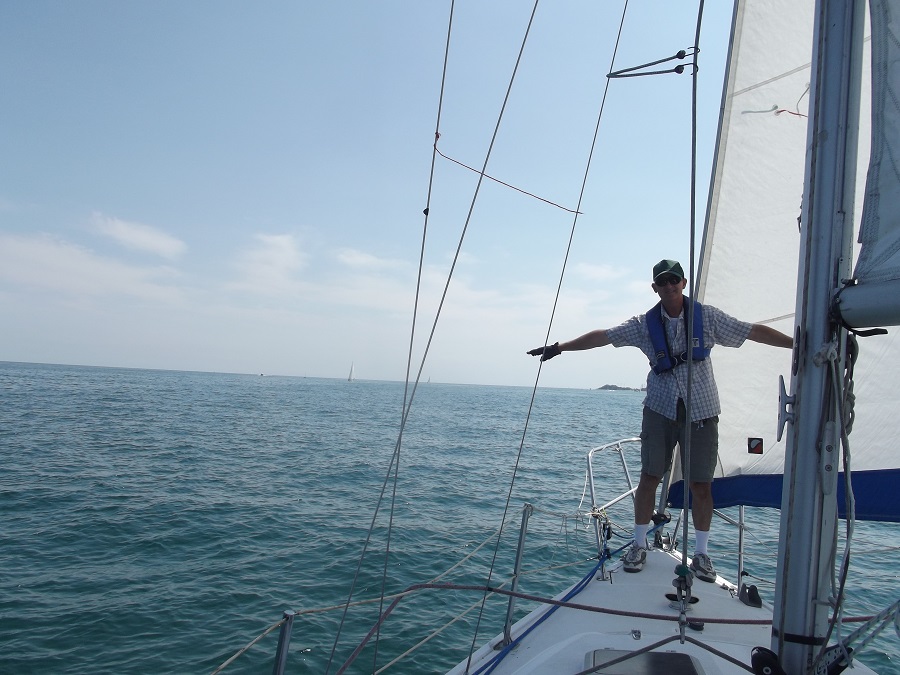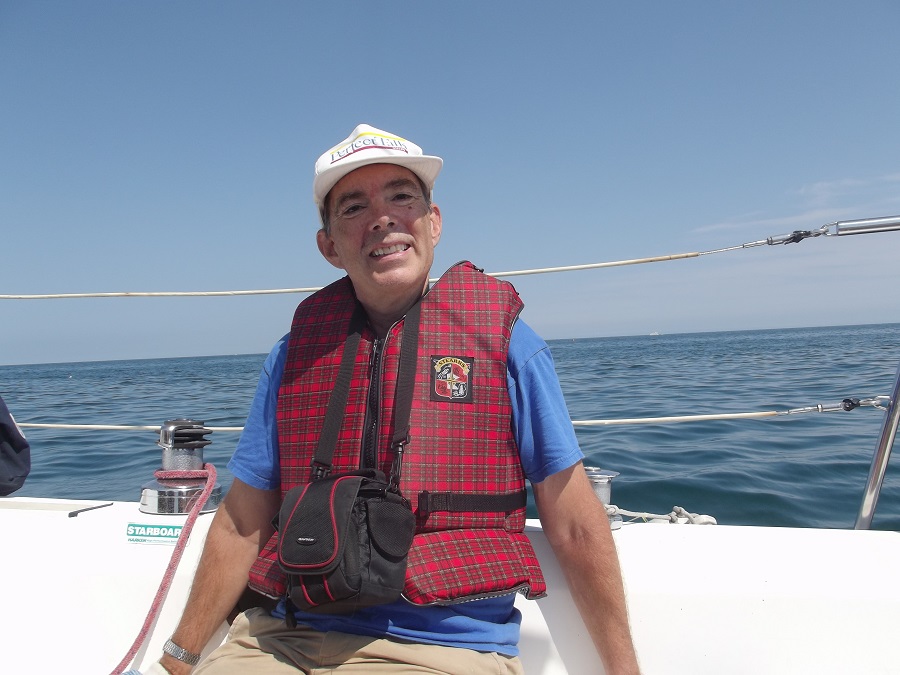 Sailboat race with smaller dark committee boat