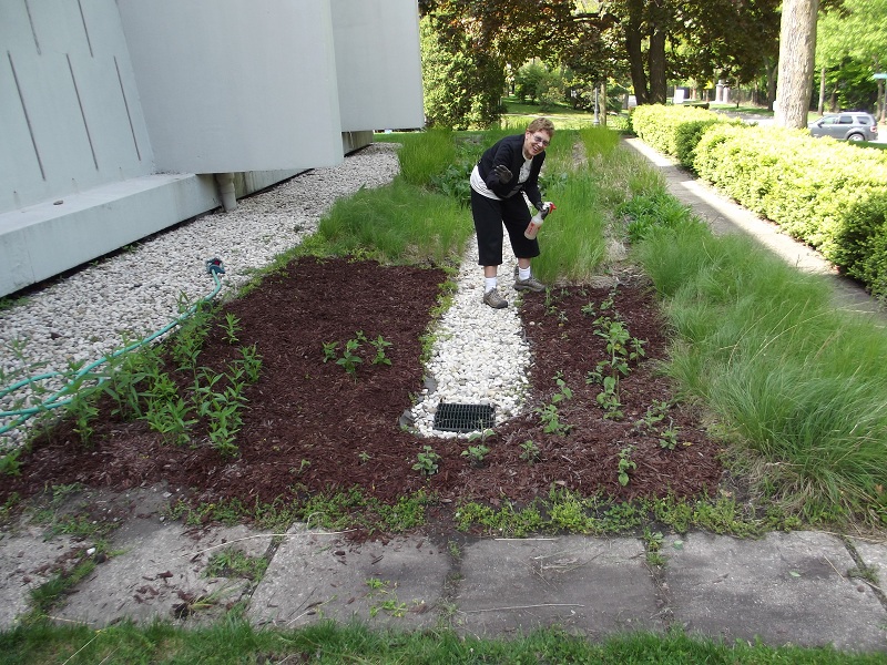 Marjorie's Rain Garden after trimming and weeding with Dick Whitaker at south end near east steps to church