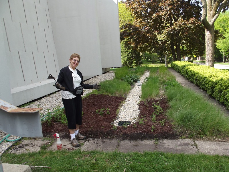 Barbara Butz in Marjorie's Rain Garden after we had completed mulch and weeding 5/9/12