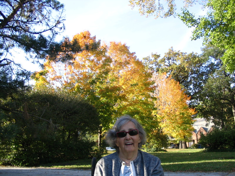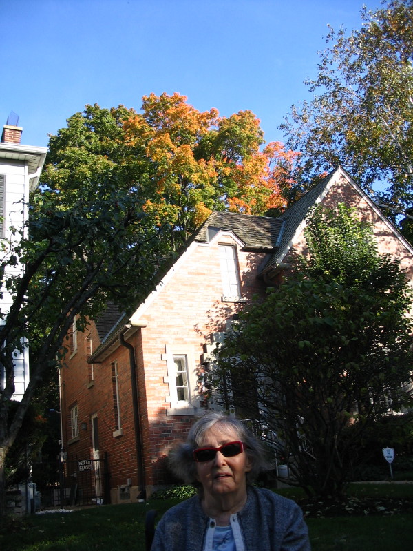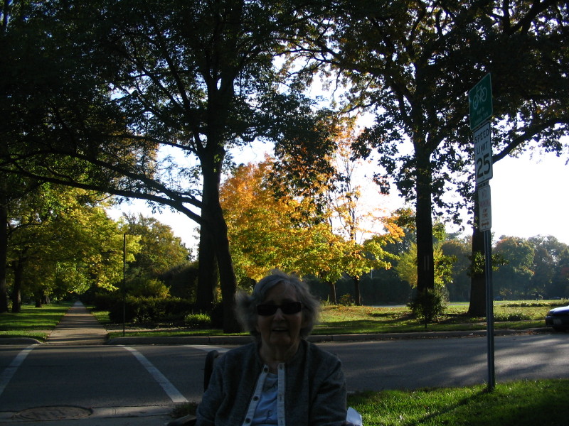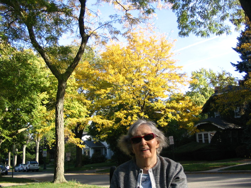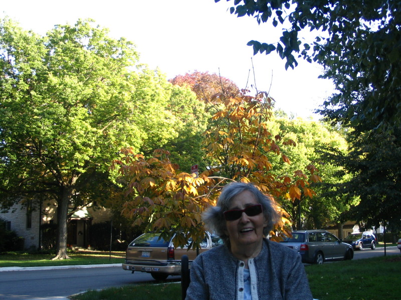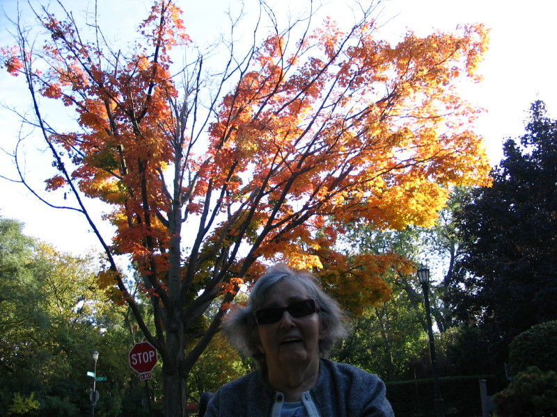 Marjorie and colored trees in old Kendall College site from Orrington Ave