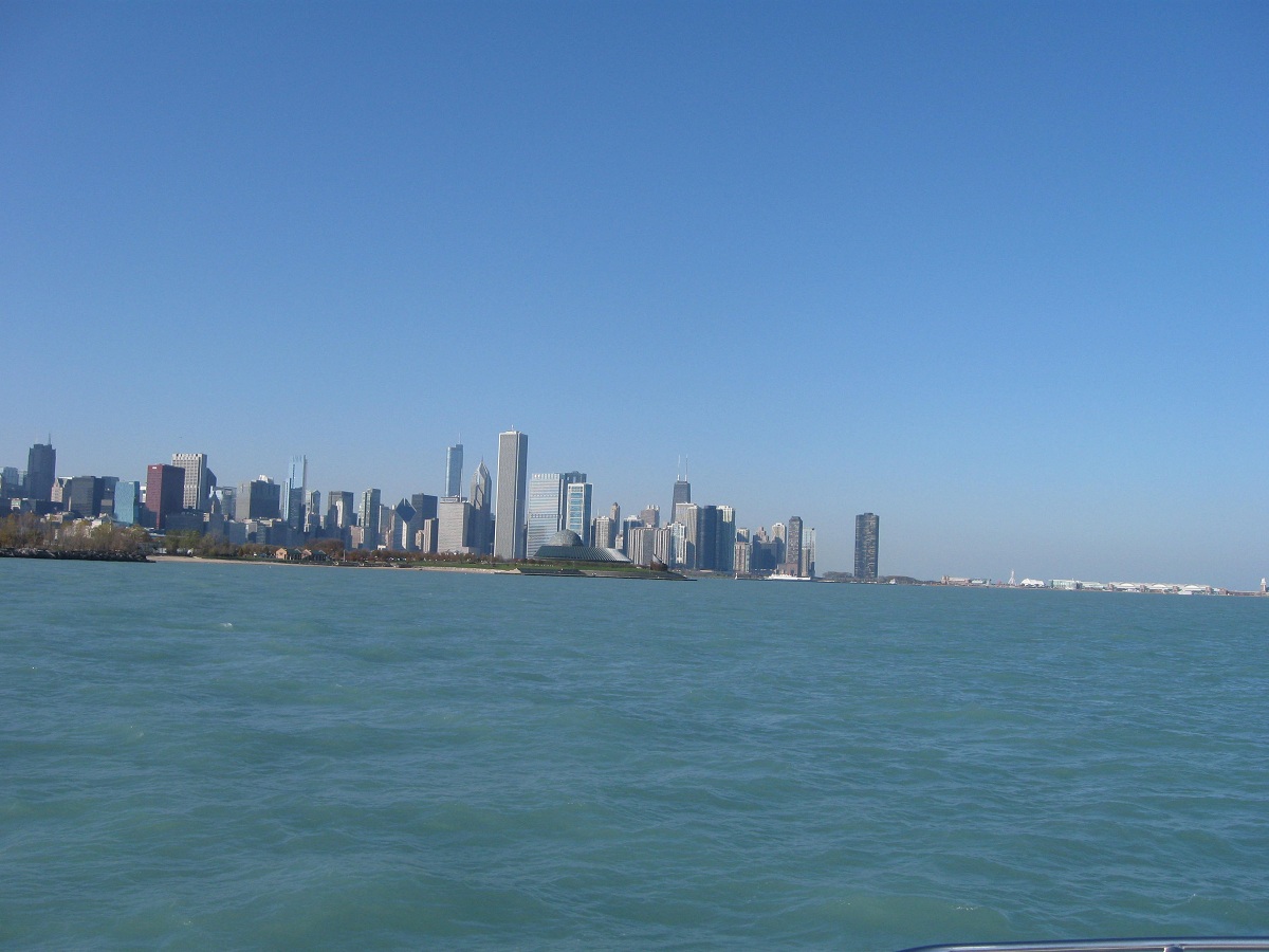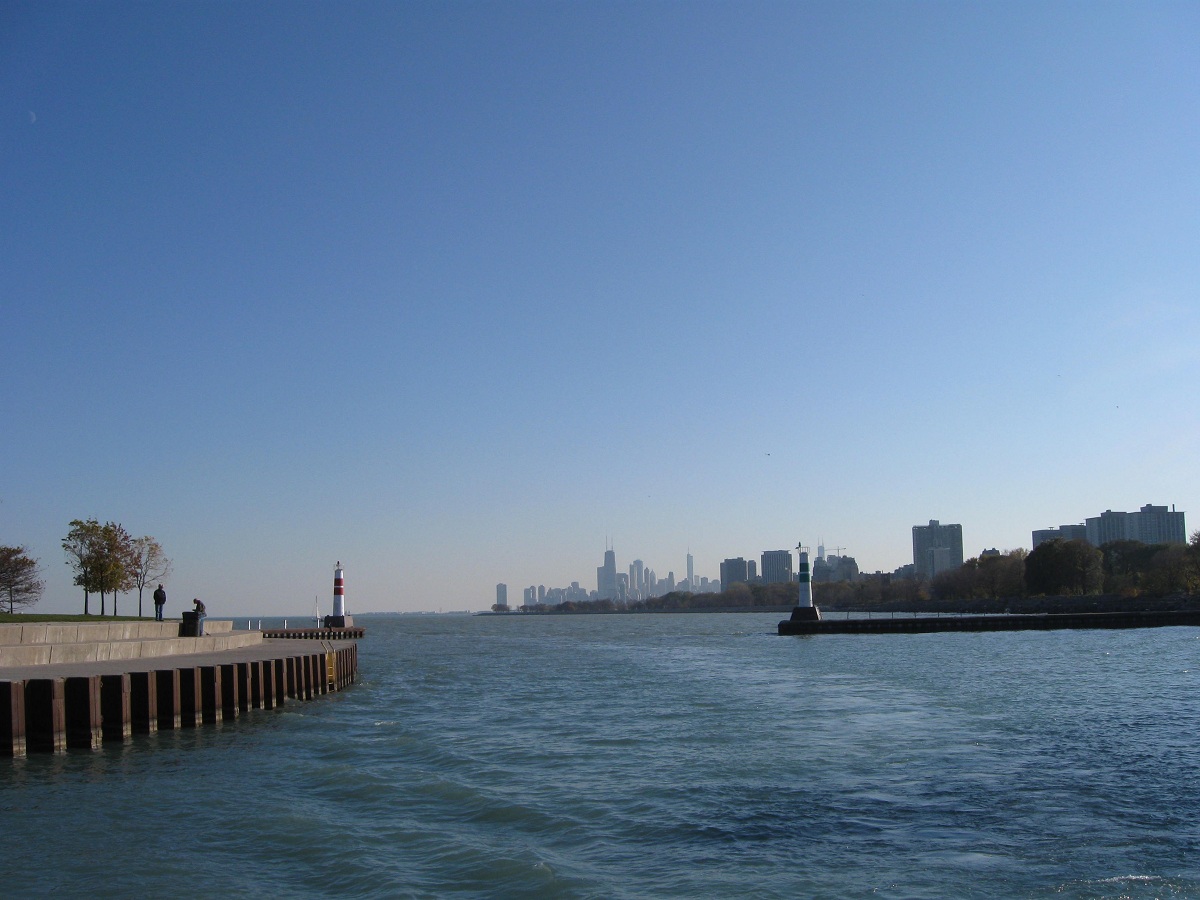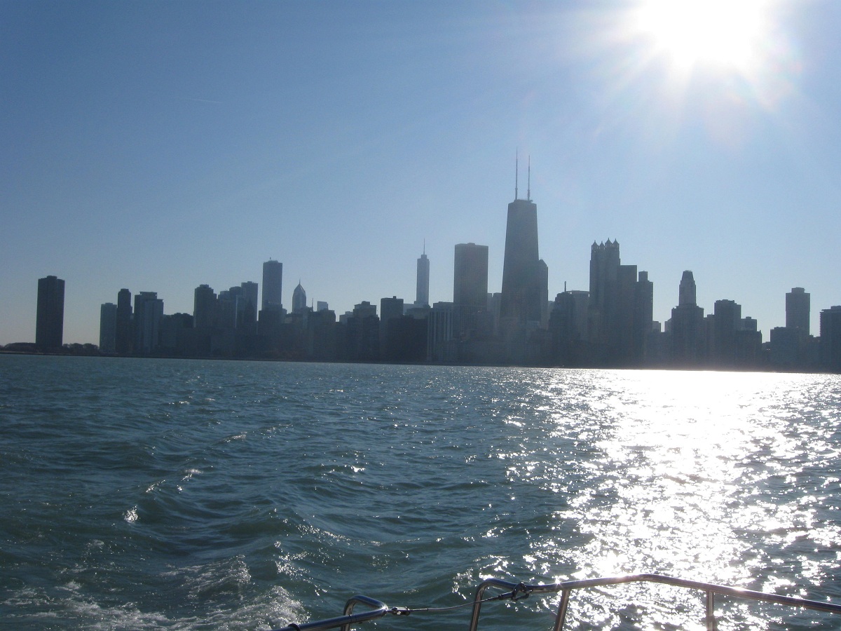 Downtown Chicago in the distance just after entering Montrose Harbor