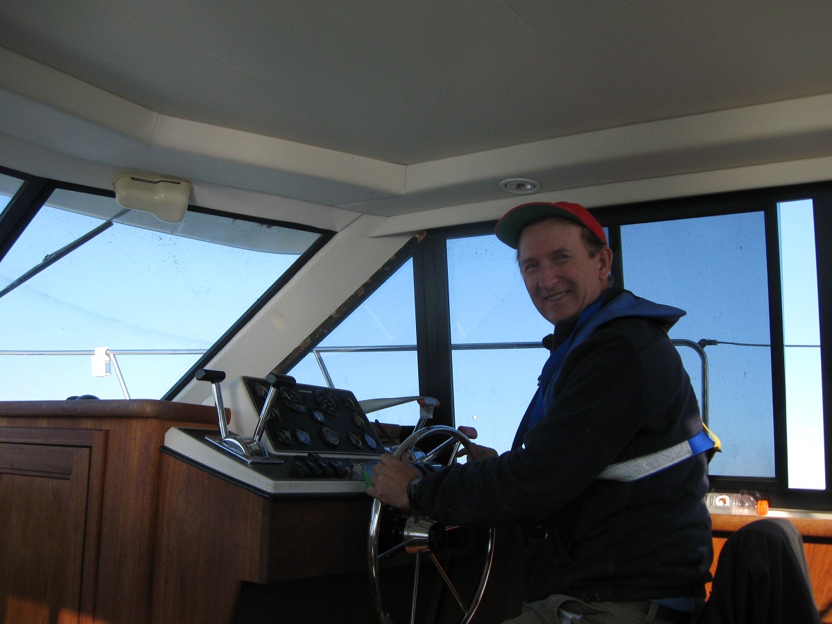 Captain Bill Luksha at the helm. The black levers controlled the gears (forward, neutral, reverse), and the red levers controlled the throttle. This engine would stall at low,