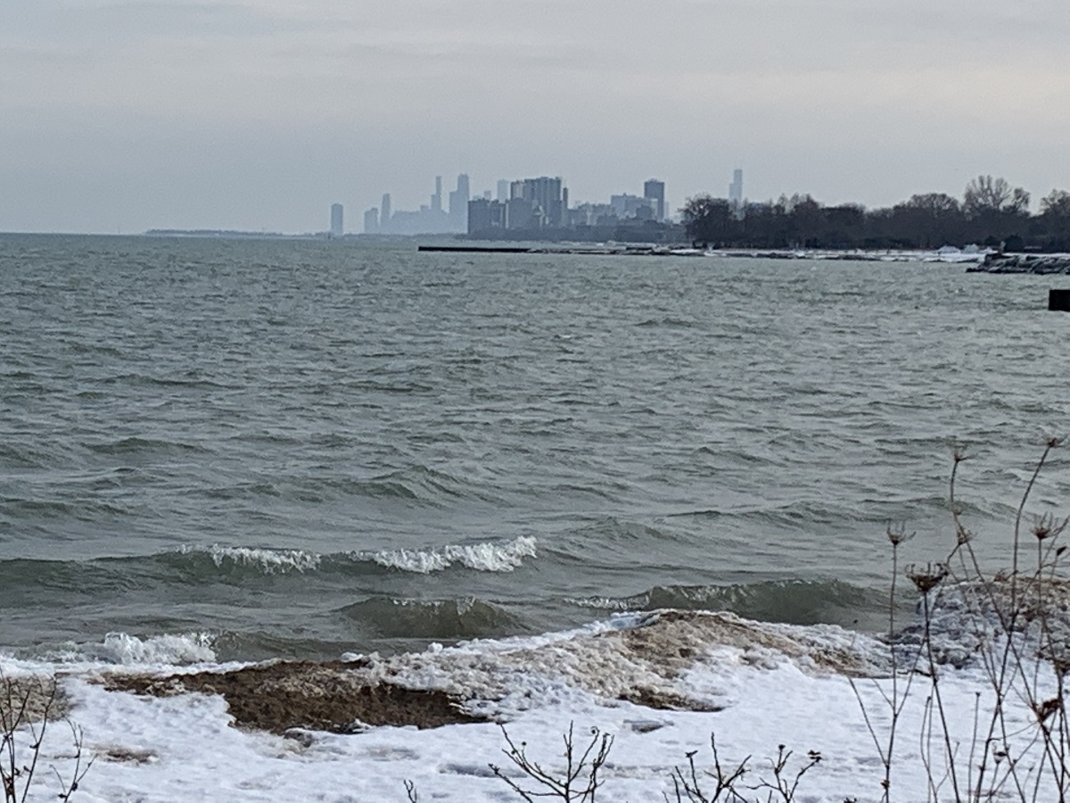 Vieew of Chicago skyline from NU landfill -- note new slim condo high rise just to the left of the Hancock building