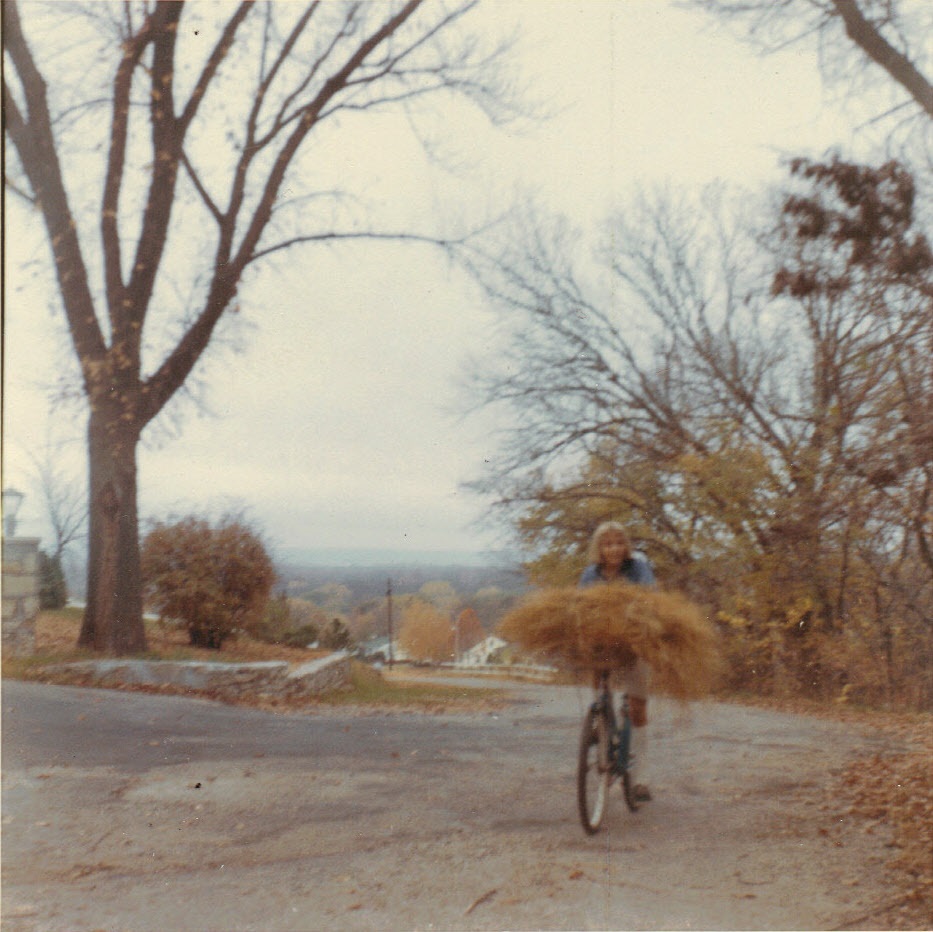 Dorothy biking up Sunnyslope land with hay -- fall, 1966