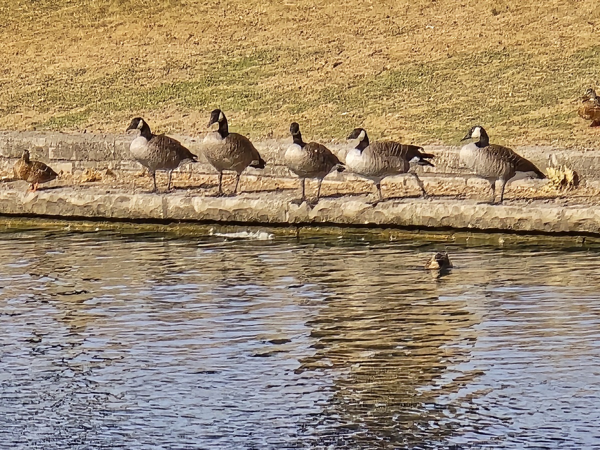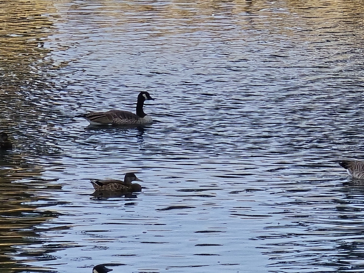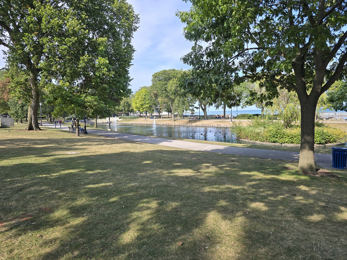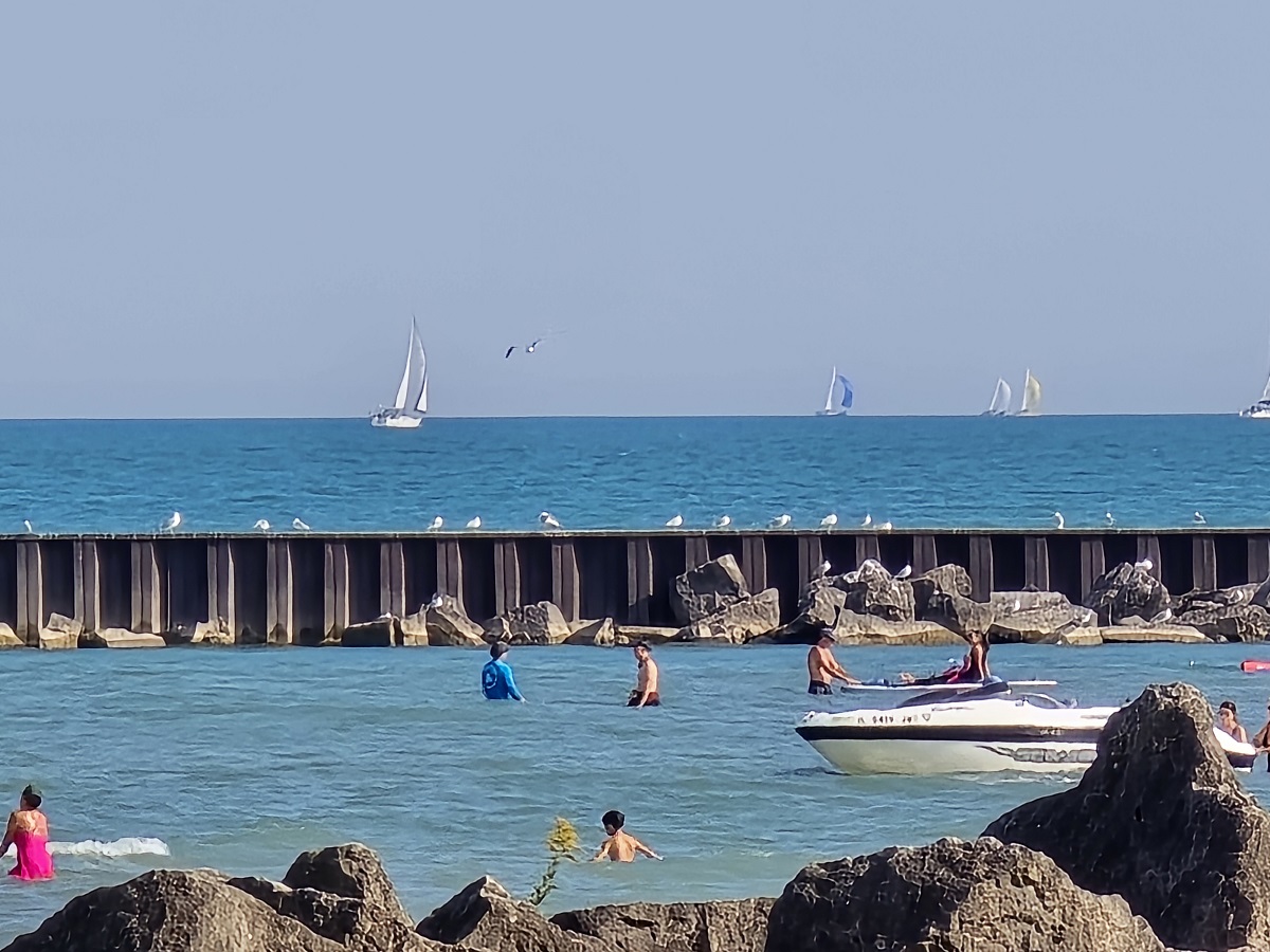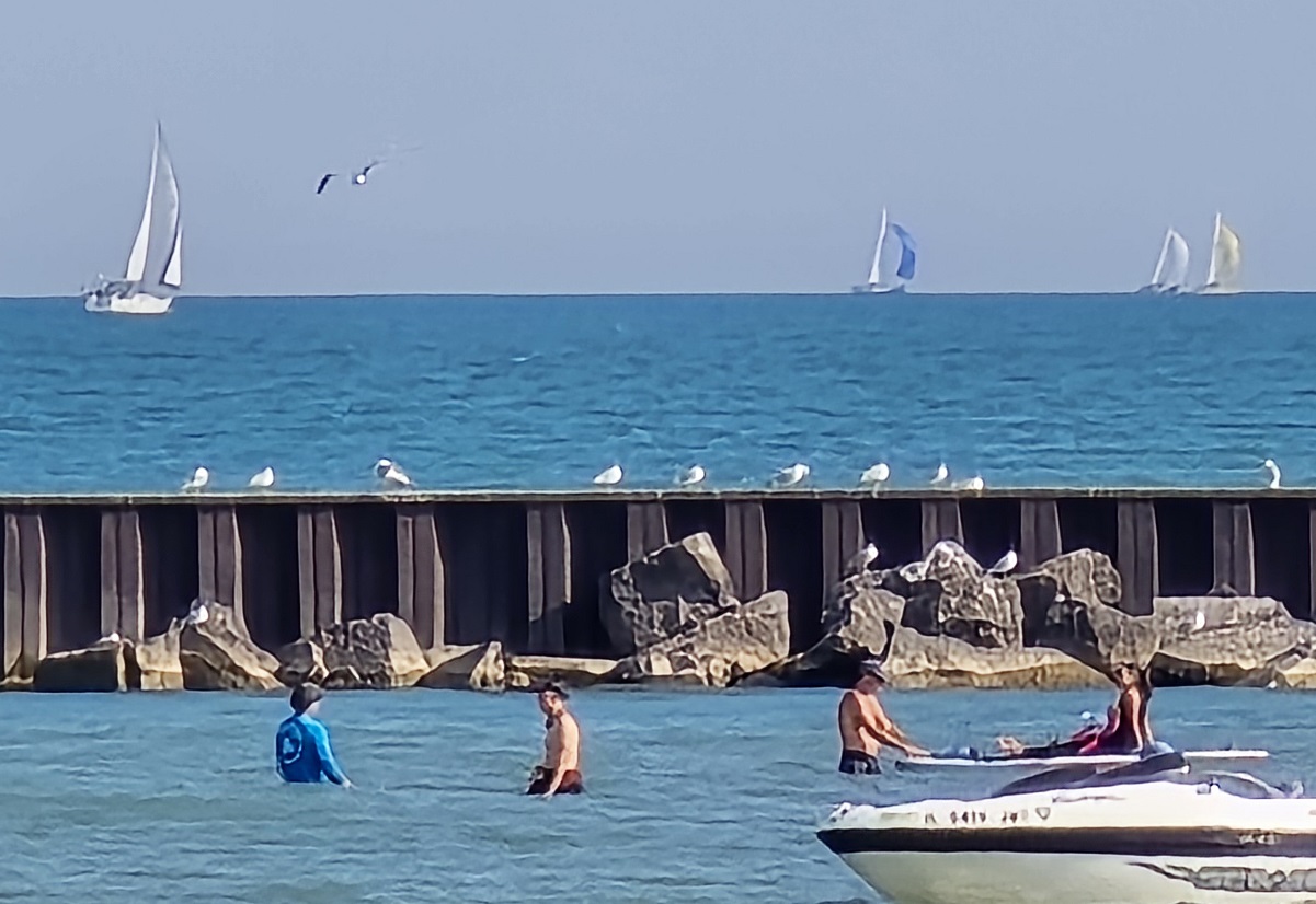 Telephoto of folks swimming at Depmster Beach with sailboats much further away