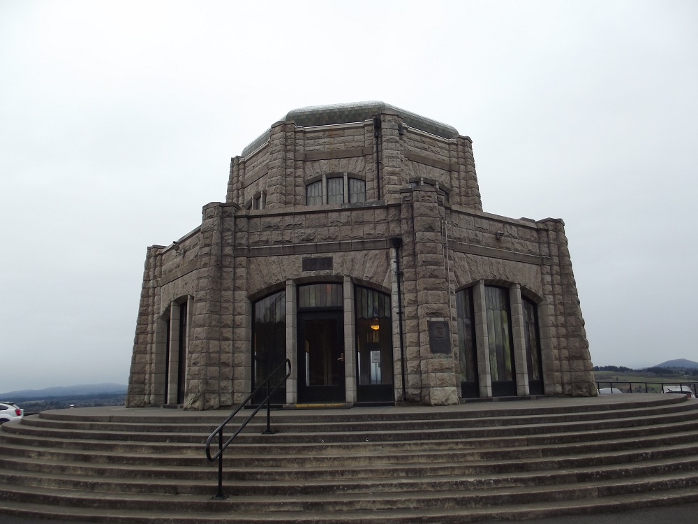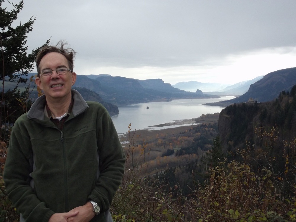 Andy with Columbia River gorge from Chanticleer Point showing Vista House on next shoulder to the right