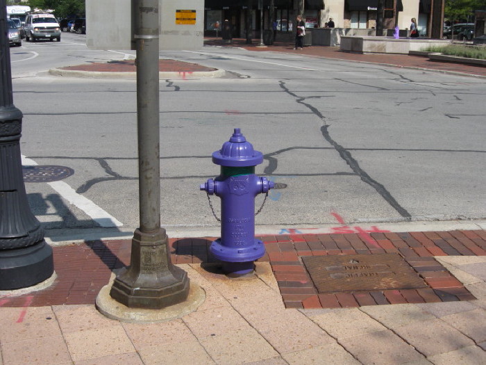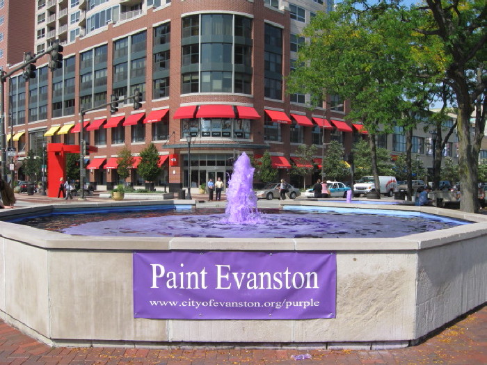 As co-operation between the merchants in downtown Evanston and Northwestern, they painted several fire hydrants purple, dyed the fountains in fountain square purple, and had a big celebration in downtown Evanston on 9/22/10 to support Northwestern winning the home football game that following Saturday.
