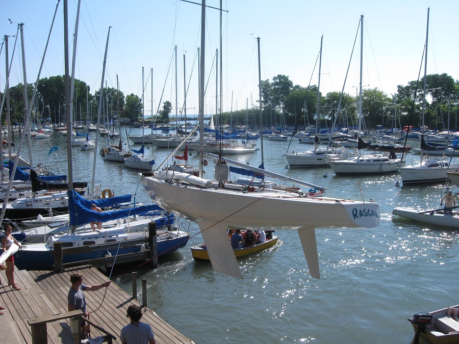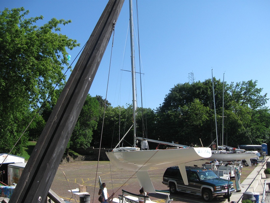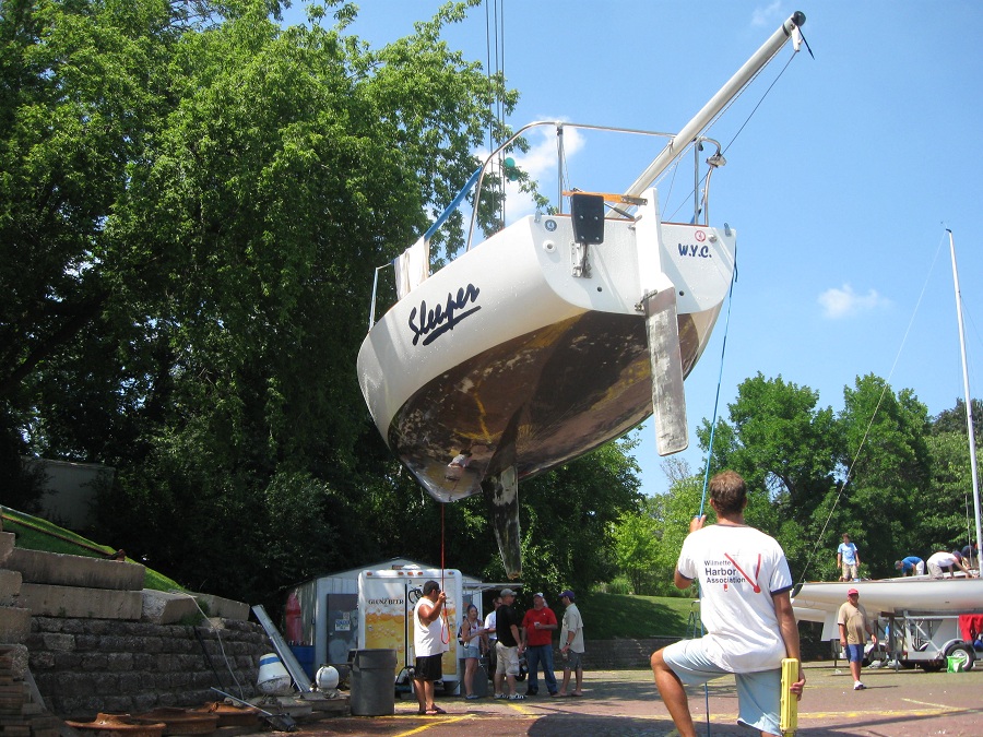Setting soling into water of Wilmette harbor