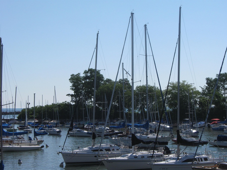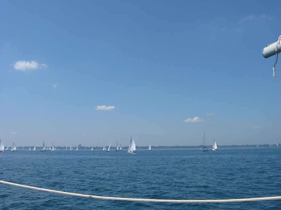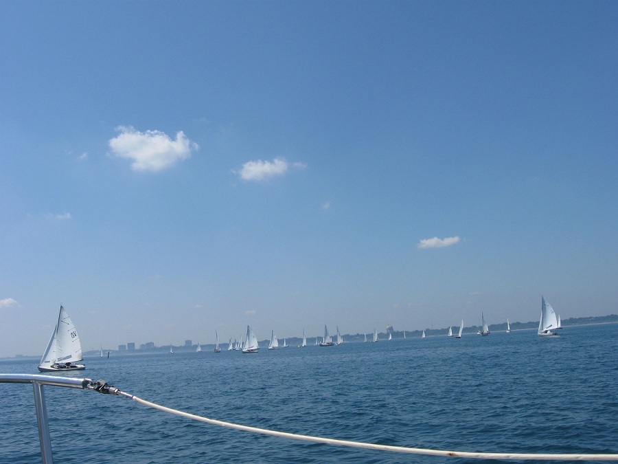 Many more boats near race committee start area with downtown Evanston and Baha'i Temple