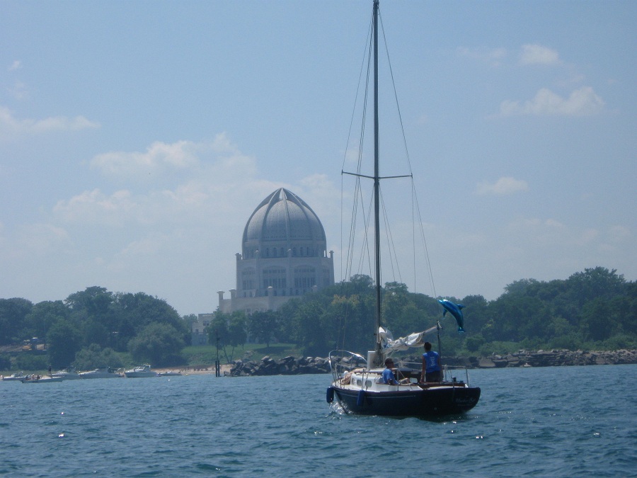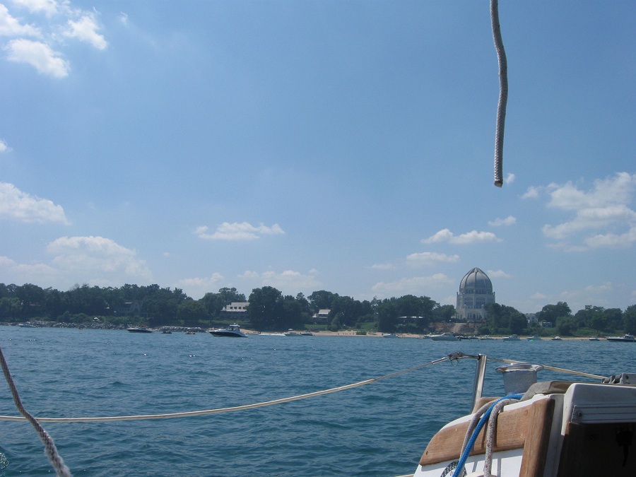 Many more boats near race committee start area with Baha'i Temple