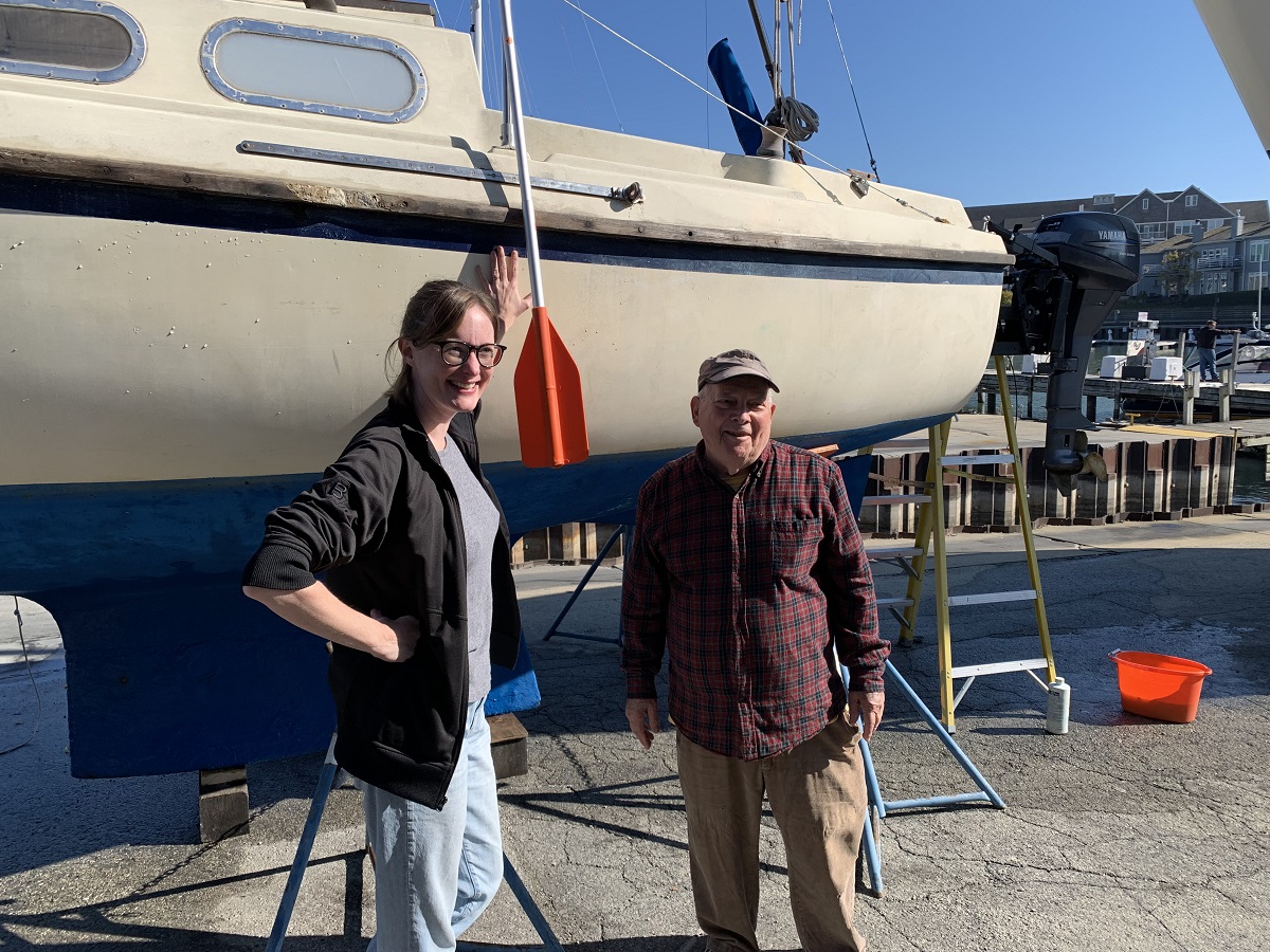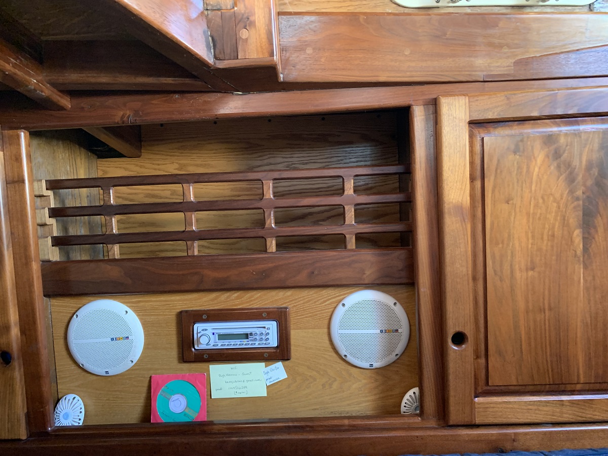 Inside Jubilee's beautiful wood paneled caben -- the boat is for sale for $100,000