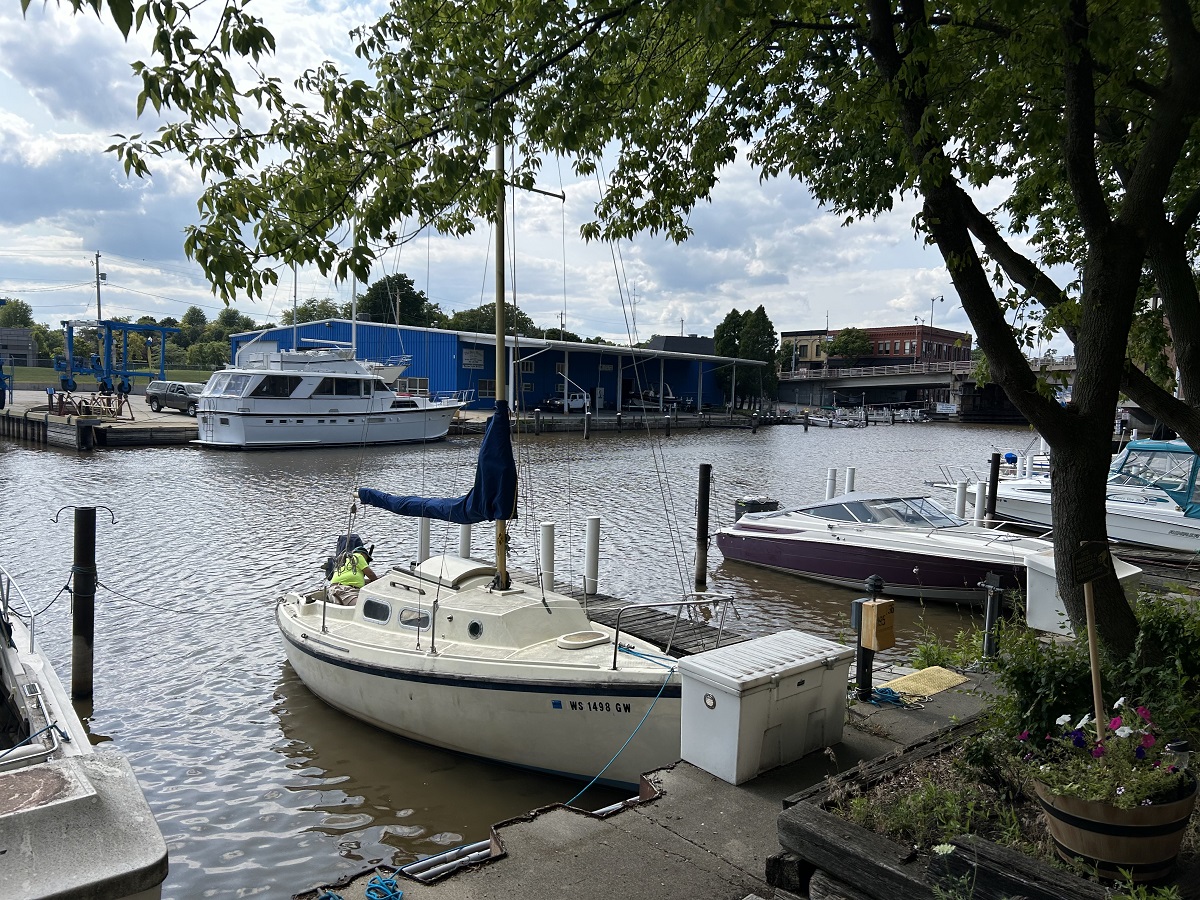 Boat safely back in slip tied up with sail cover on