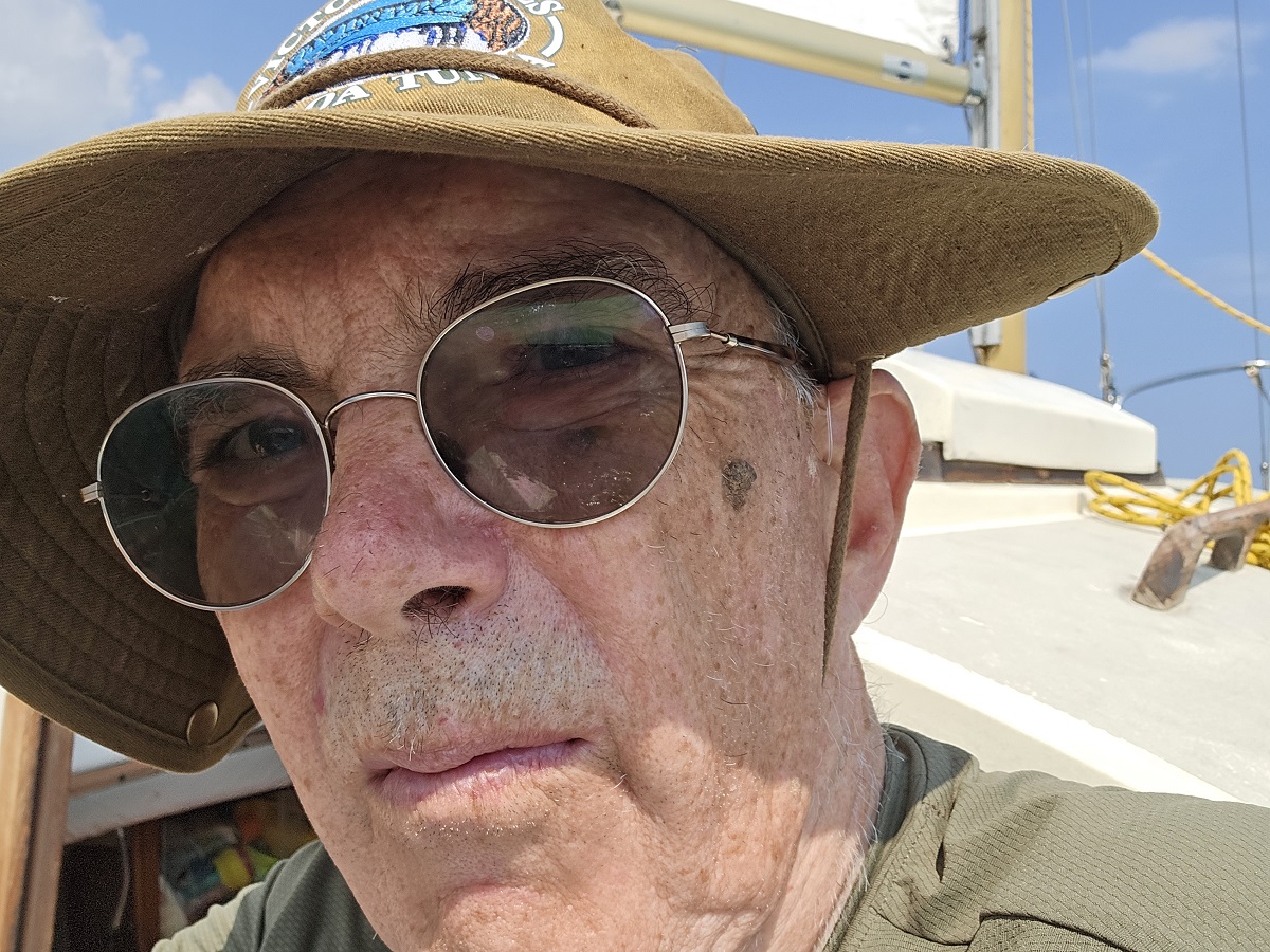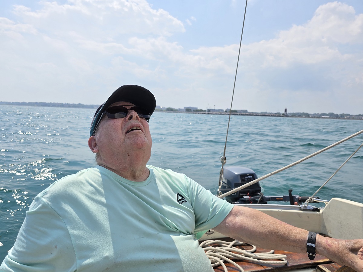 Boats at Racine slips -- Sherwin's blue mainsail cover, Dan's yellow mainsail cover