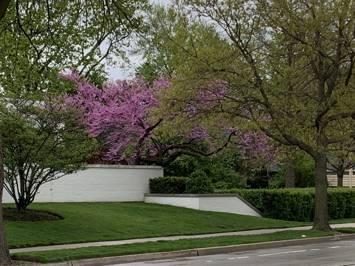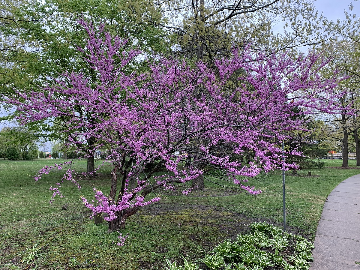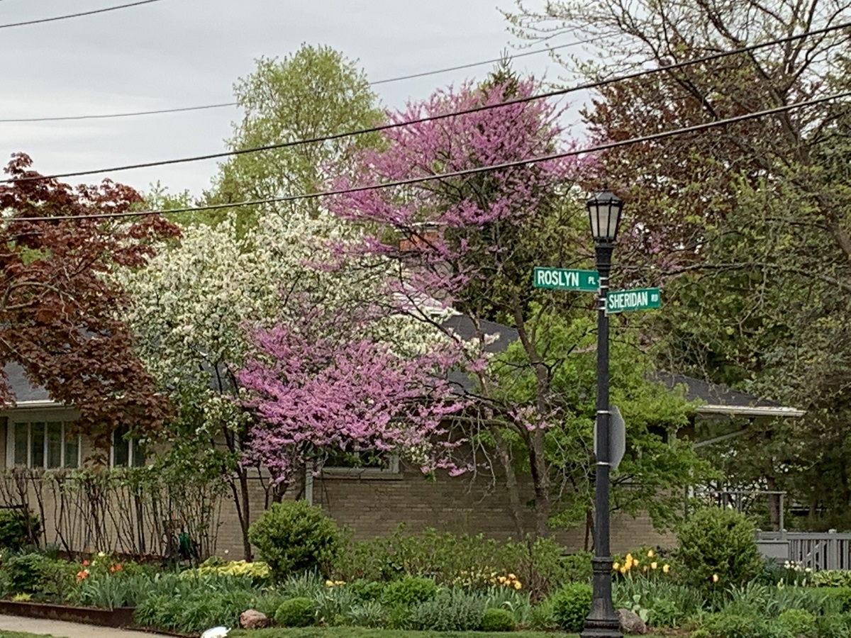 Red maple, white tree and redbud at Roslyn Place and Sheridan Road (looking NE from Wilmette where Sheridan divides Wilmette and Evanston)