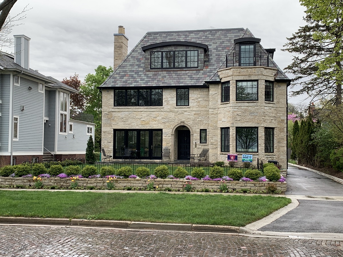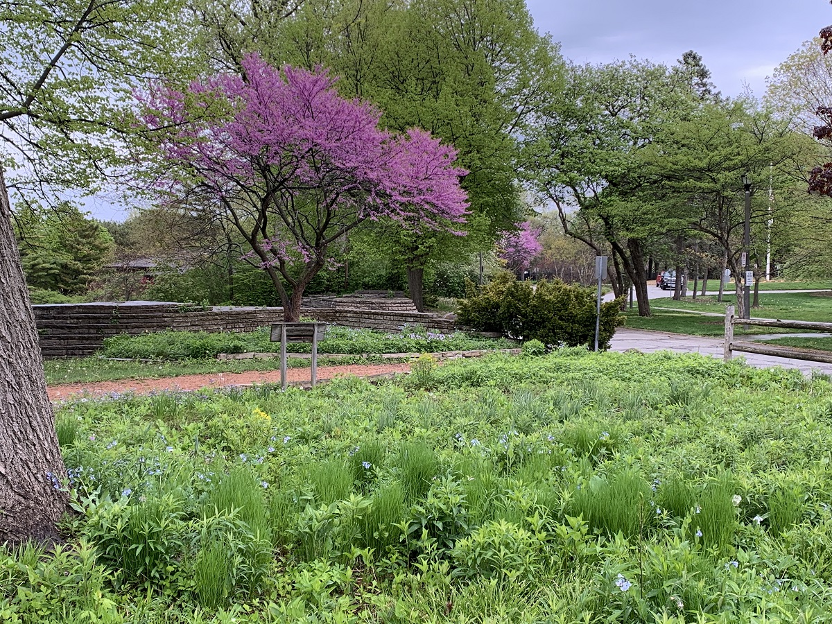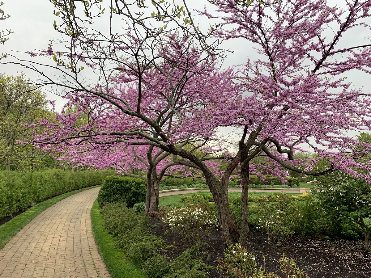 Red maple, white tree and redbud at Roslyn Place and Sheridan Road (looking NE from Wilmette where Sheridan divides Wilmette and Evanston)